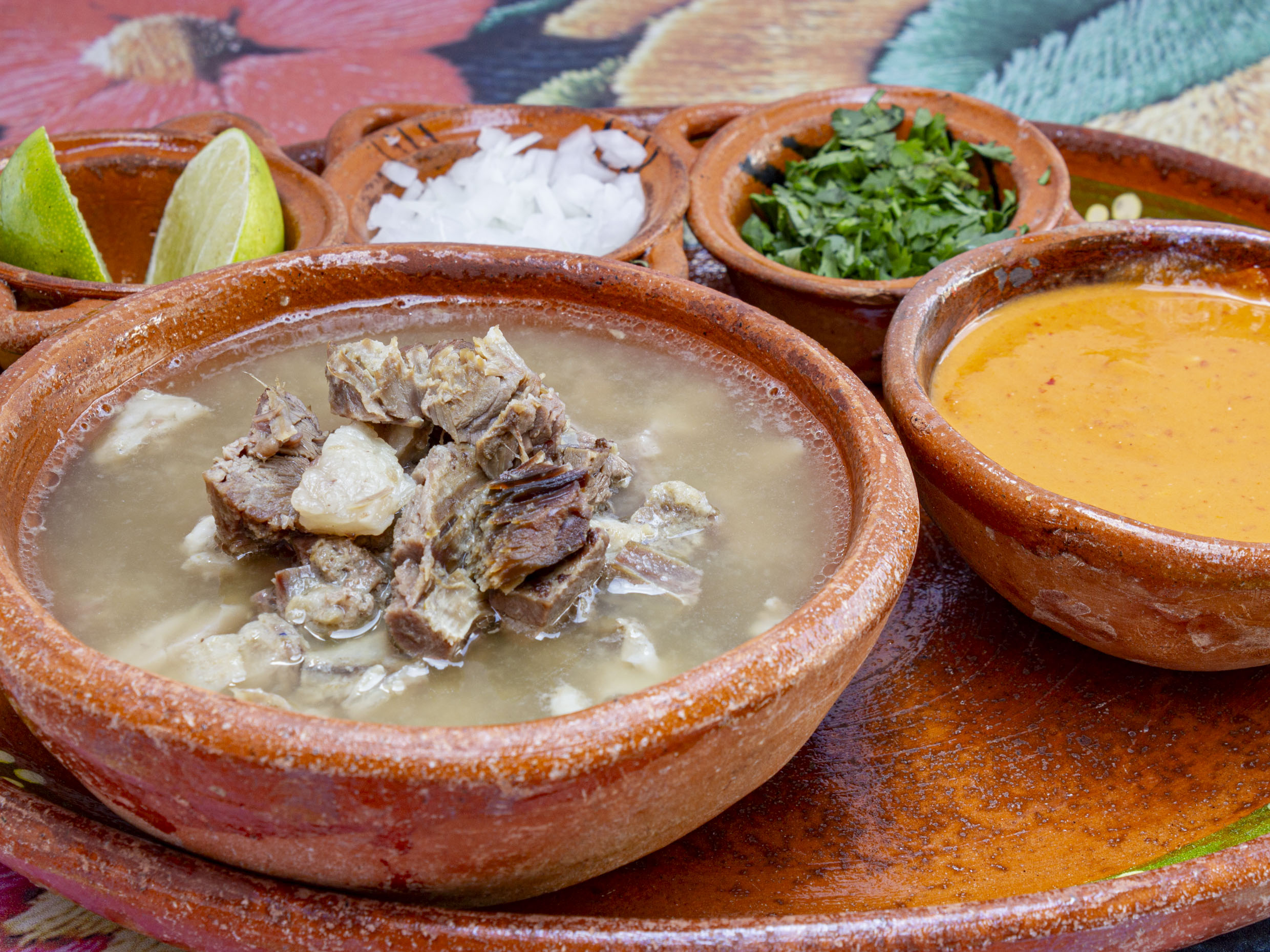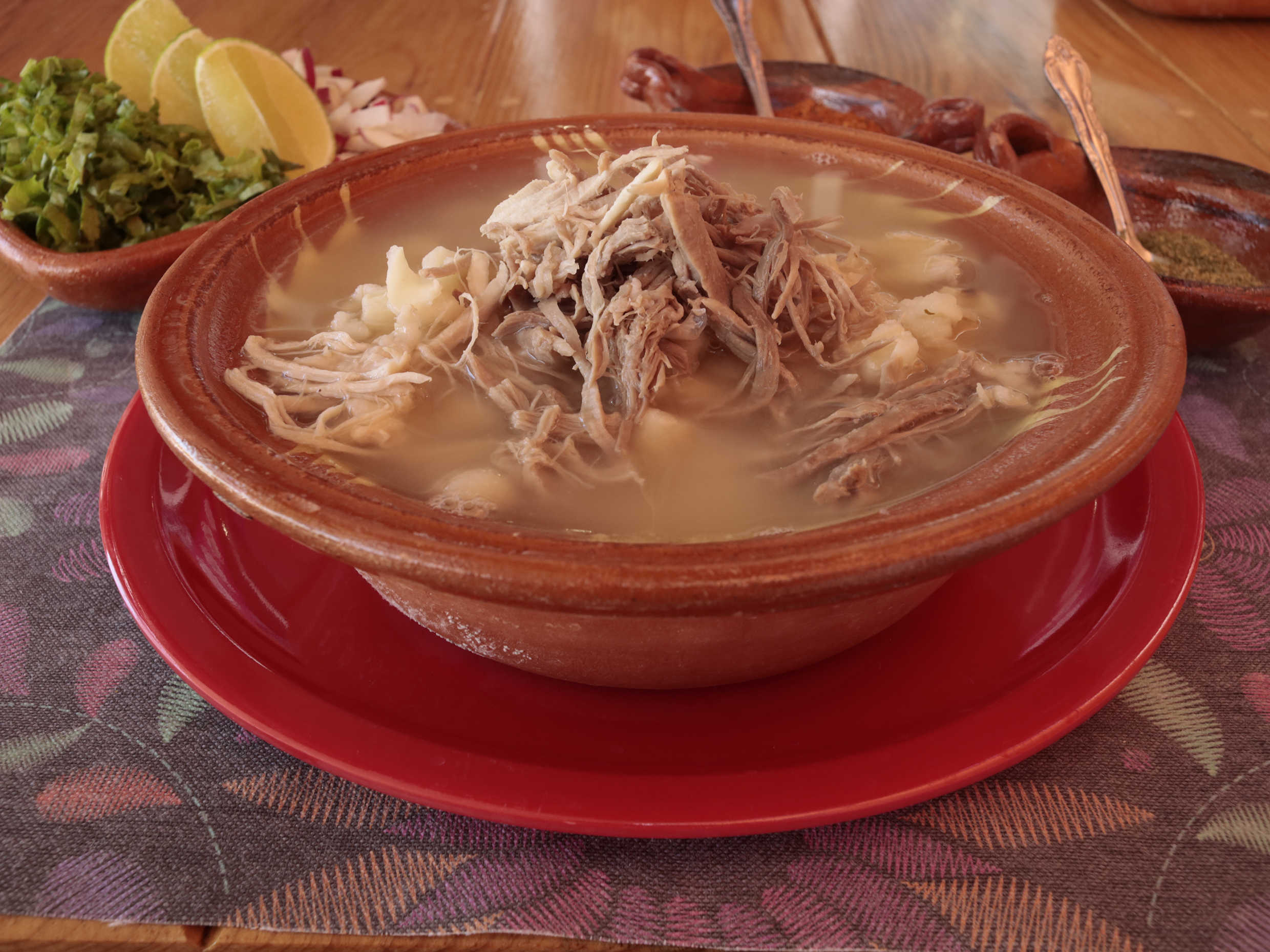 Maíz pozolero cocinado en caldo rojo de cerdo. Se envían por separado lechuga, limones, cebolla picada, rábanos, chile molido y orégano.
