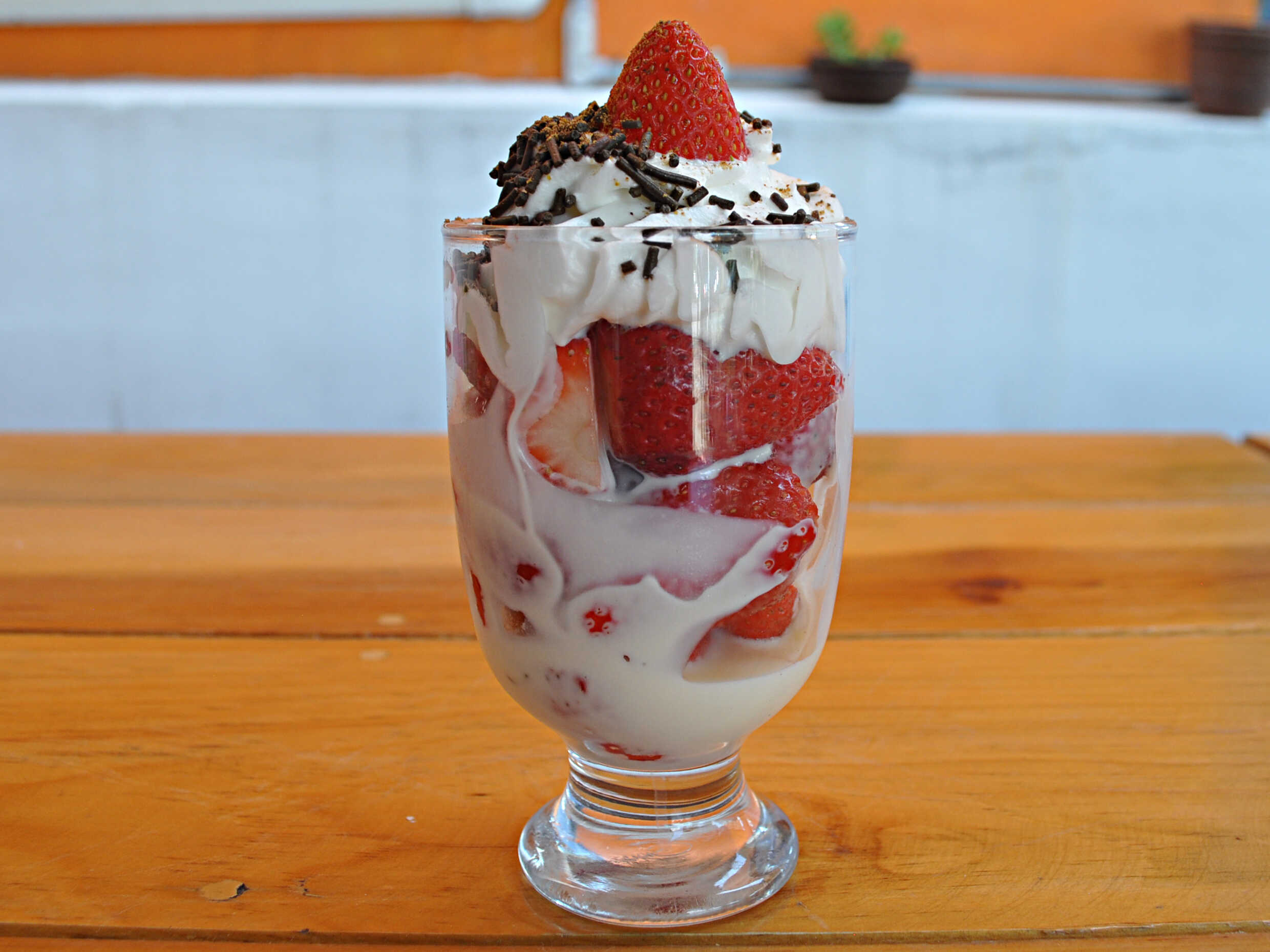 Fresas con crema de leche, crema batida y chispas.