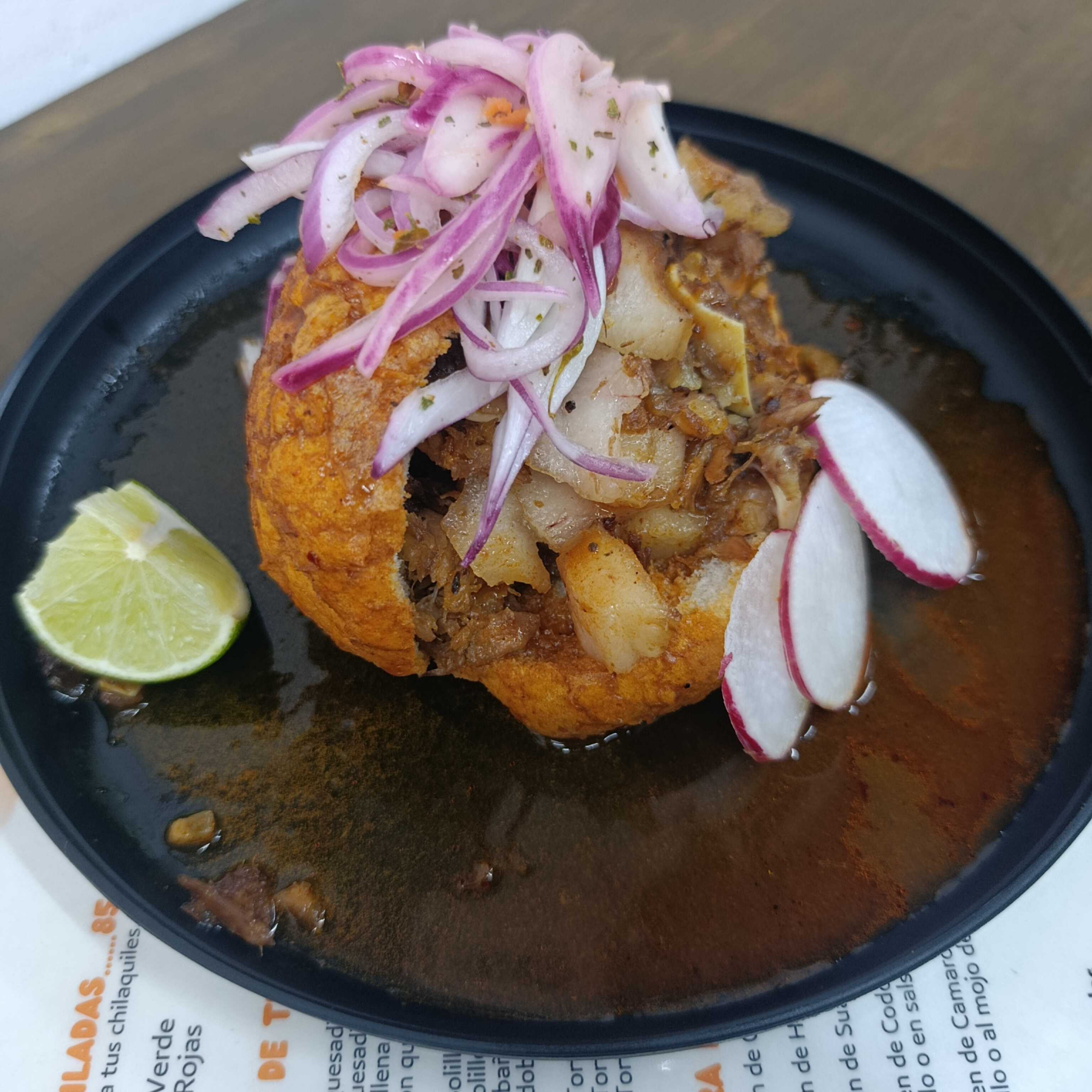 Bolillo relleno de carnitas y bañado de nuestra salsa adobada.