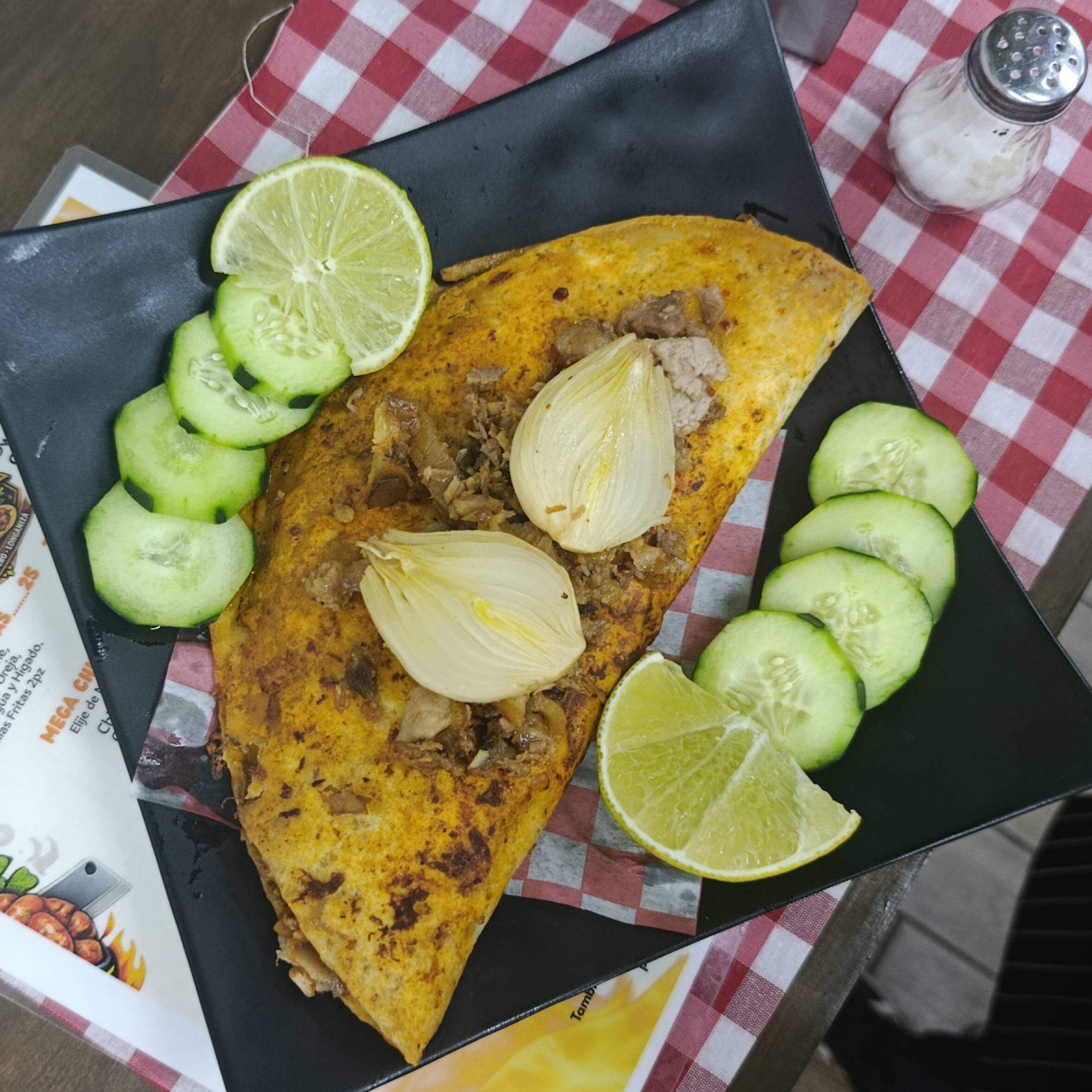 Quesadilla tamaño Jumbo rellena carne Campechana con queso manchego.