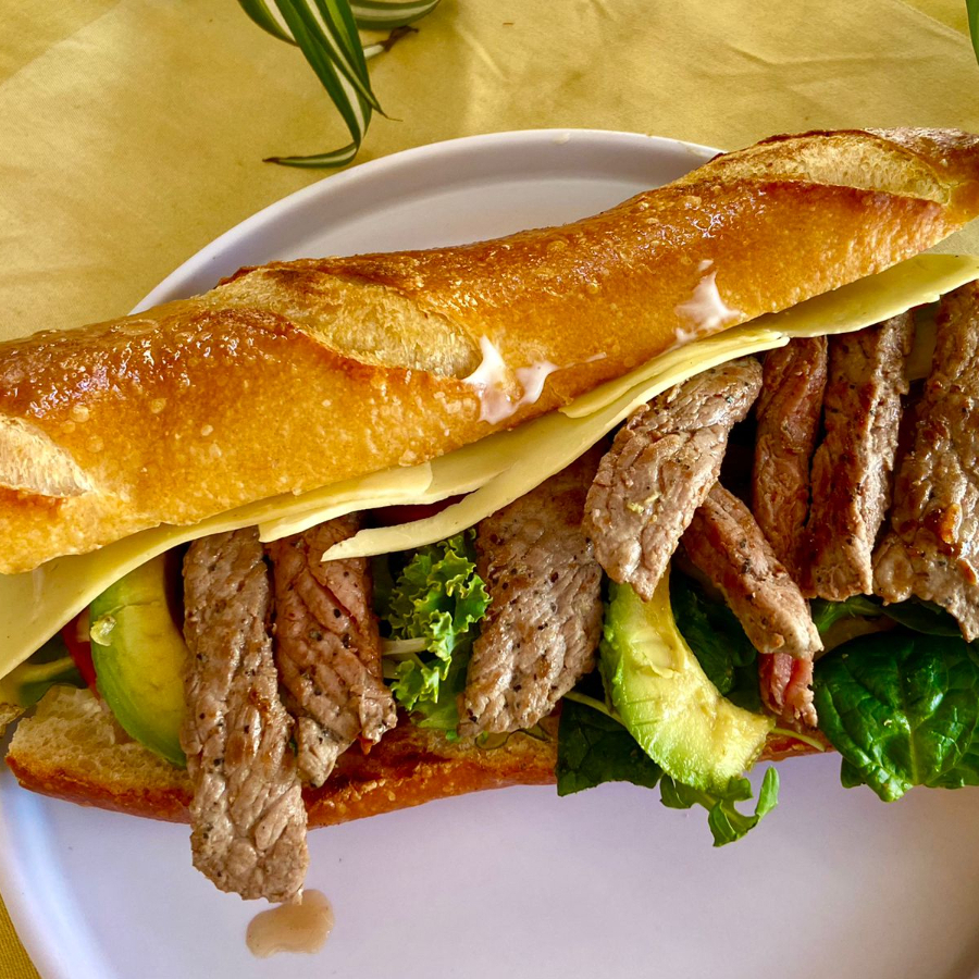 Mayonesa, aguacate, lechuga, jitomate, cebolla, chiles jalapeños y arrachera con queso manchego.