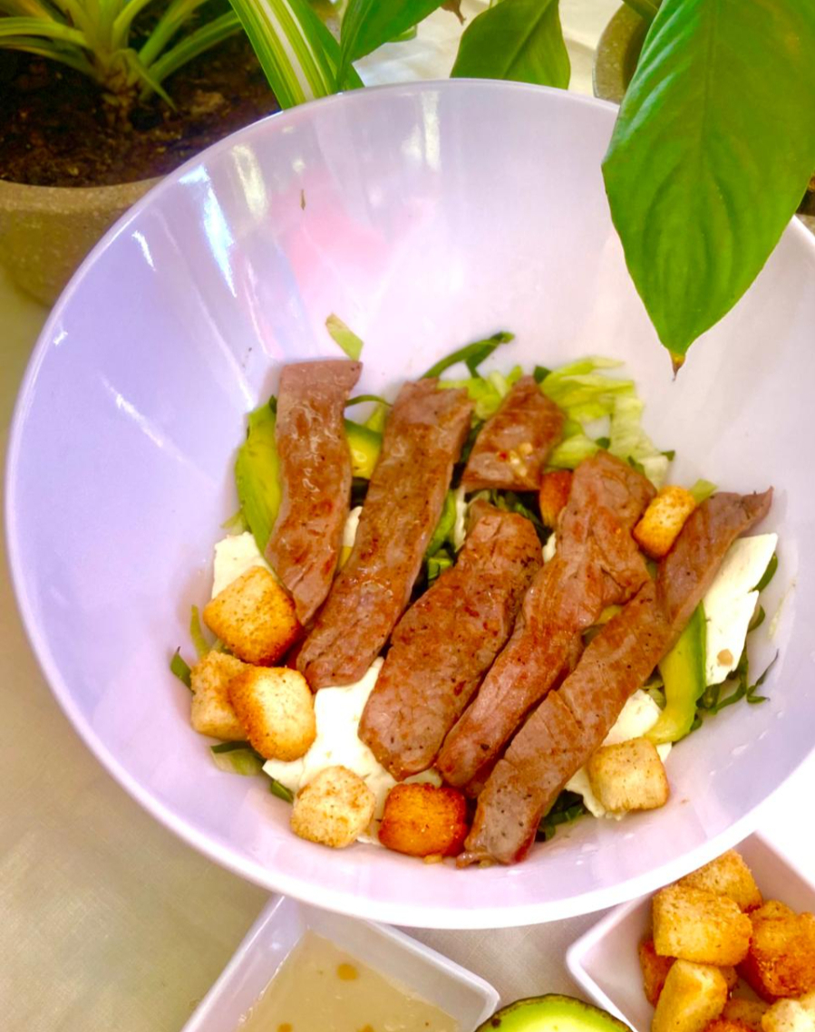 Cama de lechuga con espinacas acompañada de jitomate, aguacate, queso panela, arrachera y aderezo italiano.