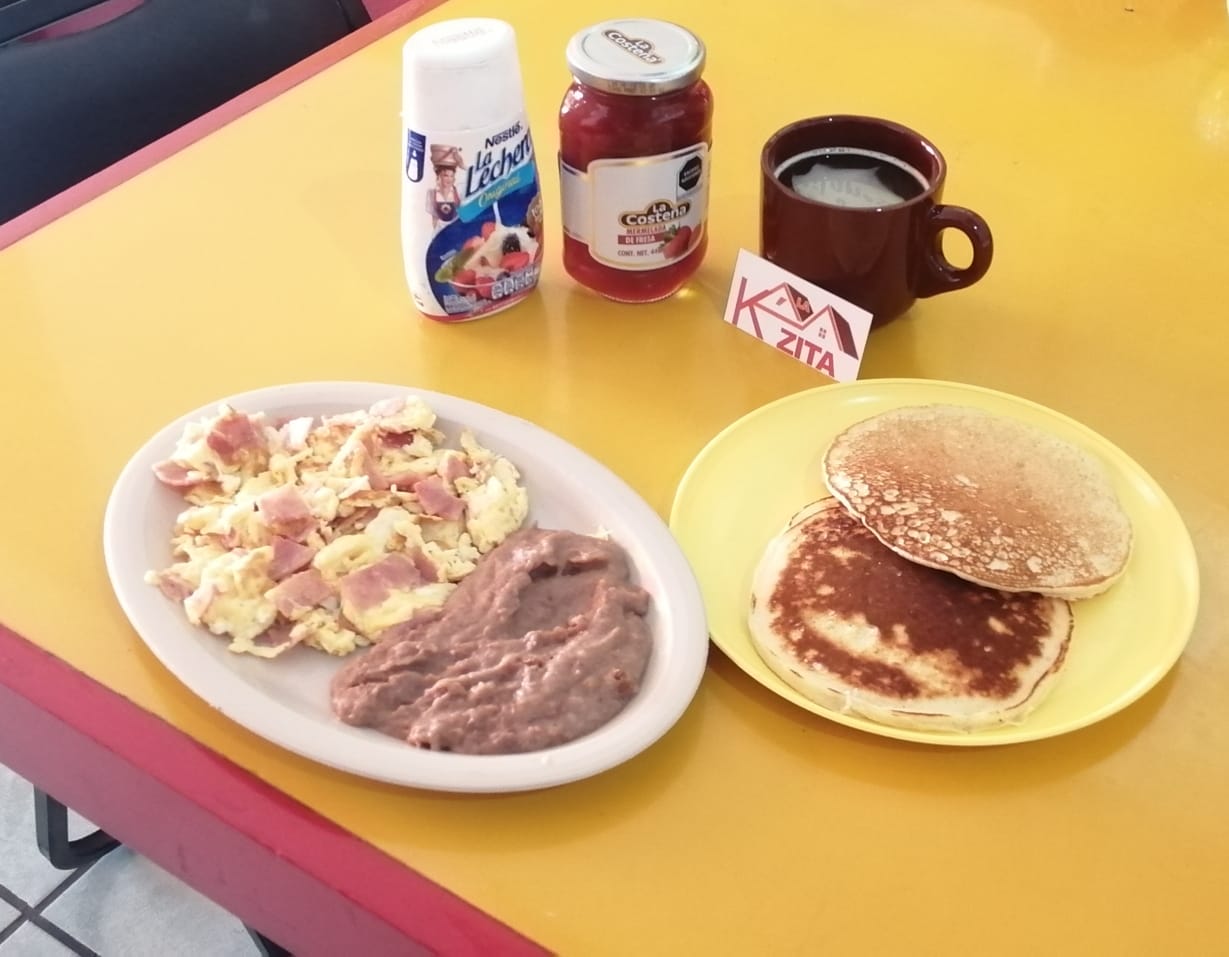 Plato con dos hotcakes, huevo, frijoles, café o agua de sabor y tortillas