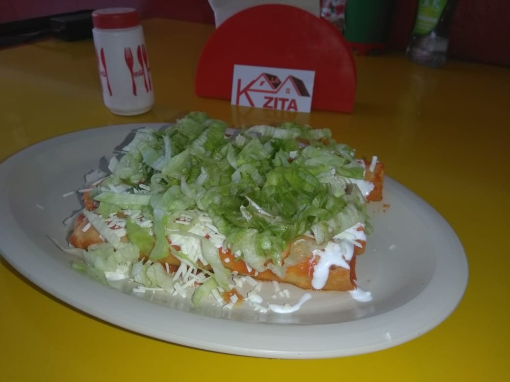 Plato con cinco enchiladas rellenas de pollo, incluye crema, queso y lechuga