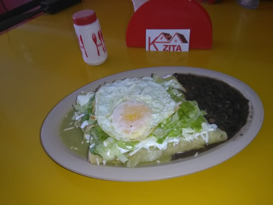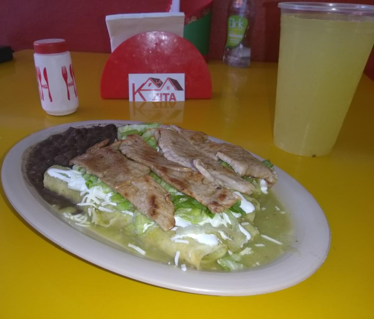 Enchiladas o chilaquiles, cecina, frijoles, café o agua de sabor