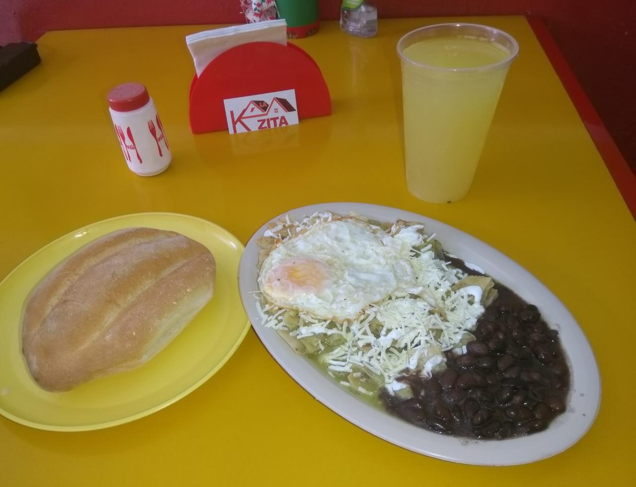 Plato con chilaquiles preparados, telera, huevo estrellado o pollo, frijoles, café o agua de sabor