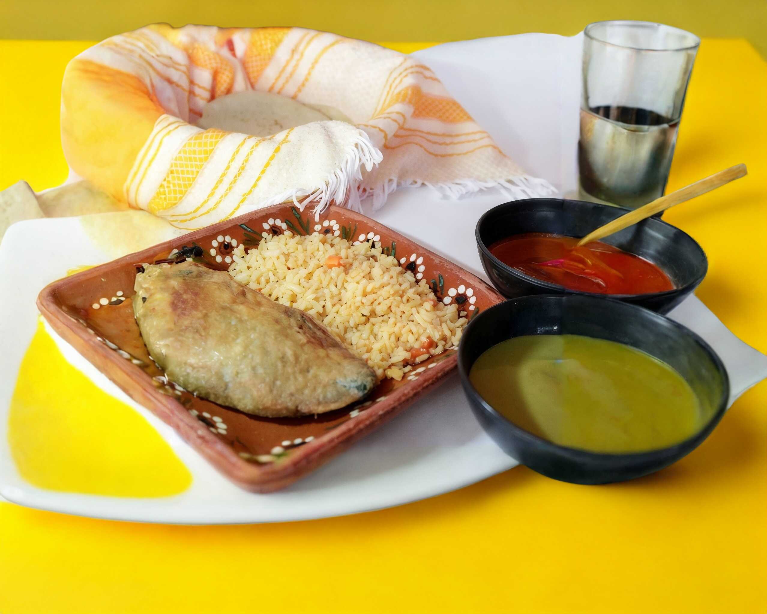 Acompañado de un aporción de arroz y 3 tortillas hechas a mano.