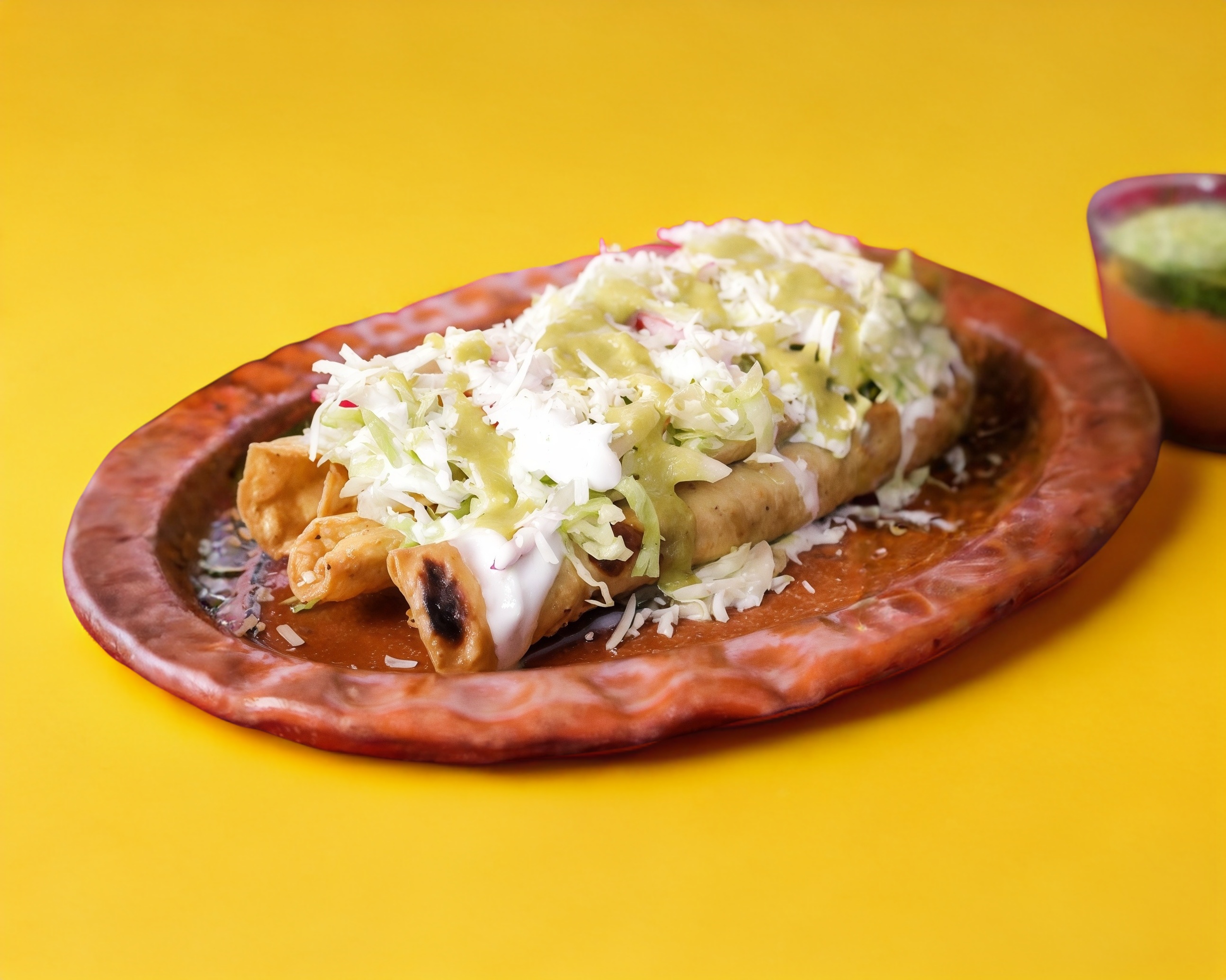 3 Tortillas hechas a mano rellenas de pollo, cubiertas con crema y queso, acompañadas on verdura o arroz.