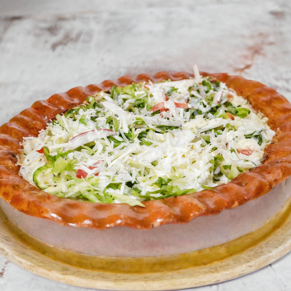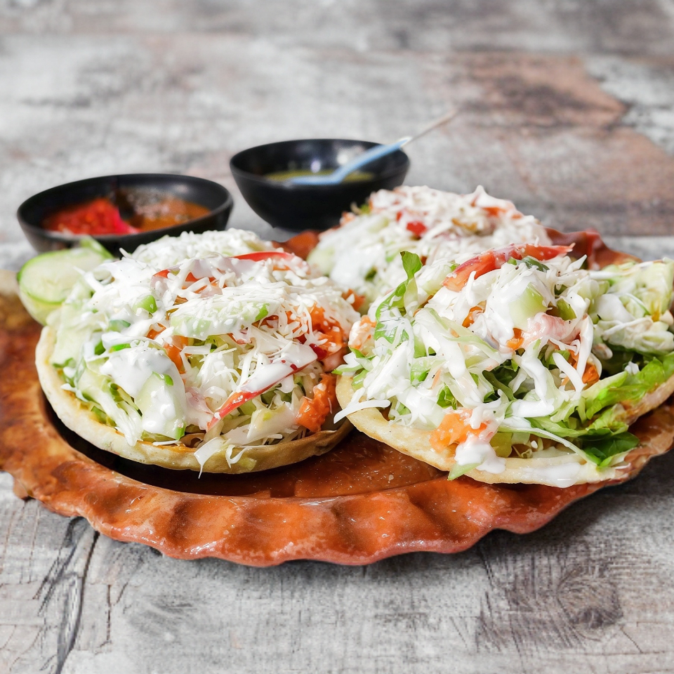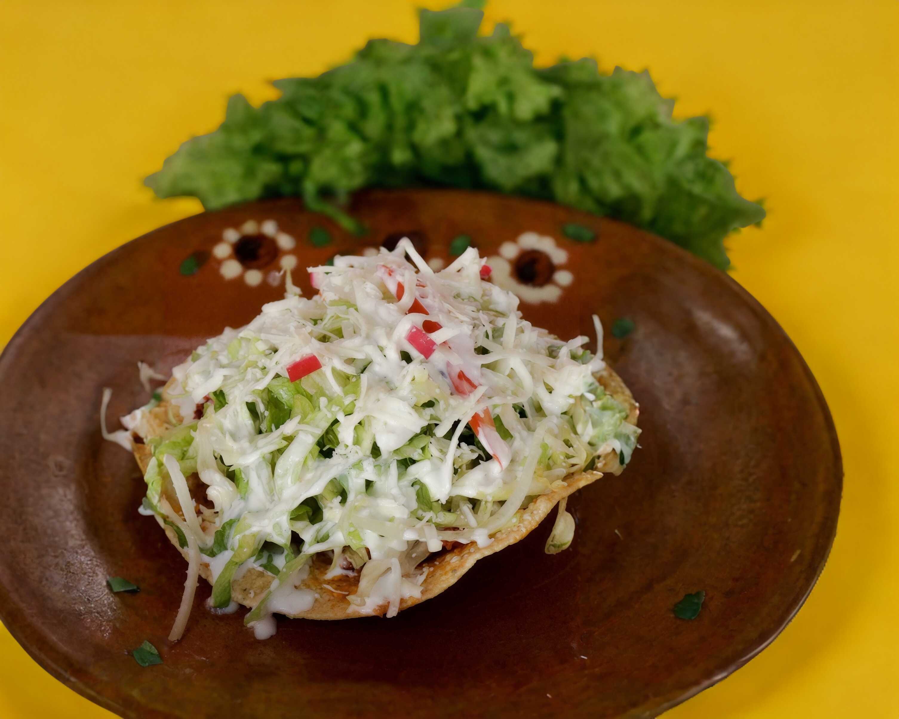 Preparada con crema, lechuga, rábanos, queso, frijol, salsa roja o verde.