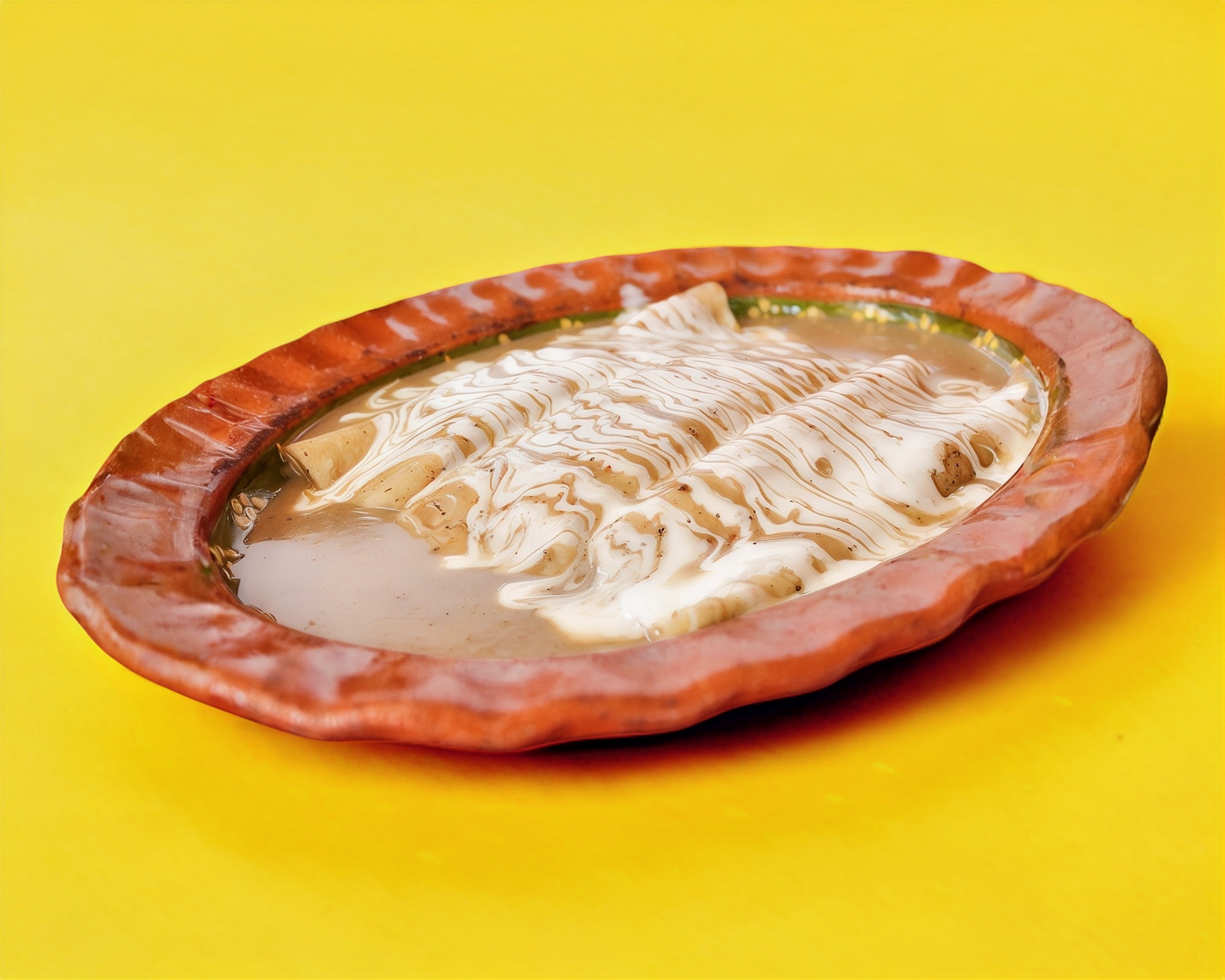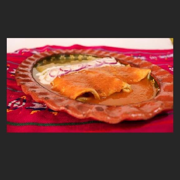 Rellenas de pollo, bañadas en salsa verde y roja , queso , crema y cebolla morada