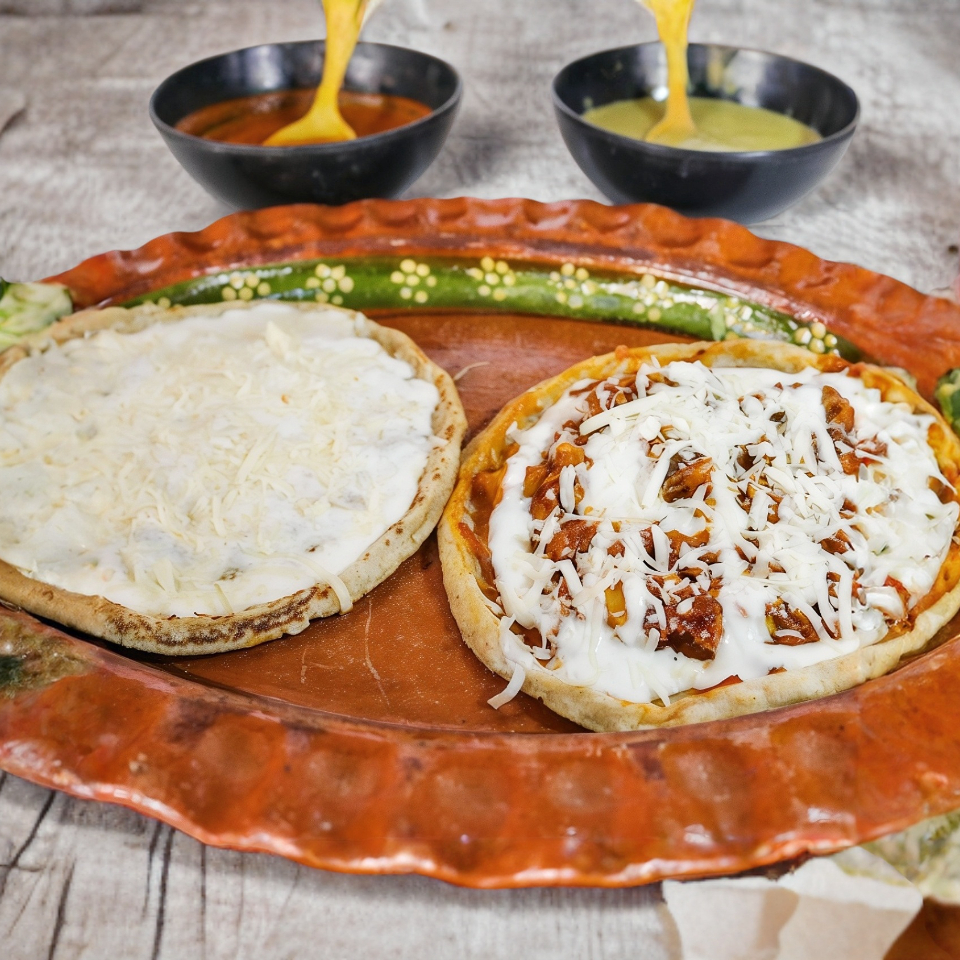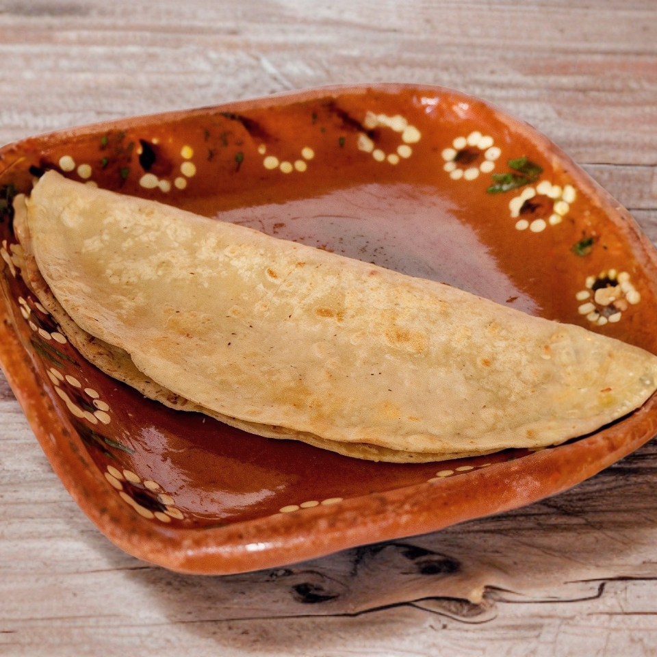 3 Tortillas hechas a mano rellenas de pollo o queso oaxaca, acompañadas de una porción de frijoles.