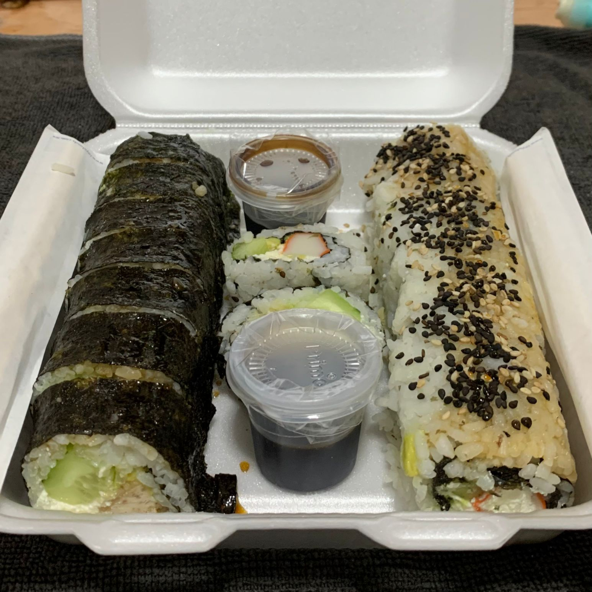 1 ROLLO DE SUSHI, 3PZ DUMPLING, 1/2 LT TE NEGRO.