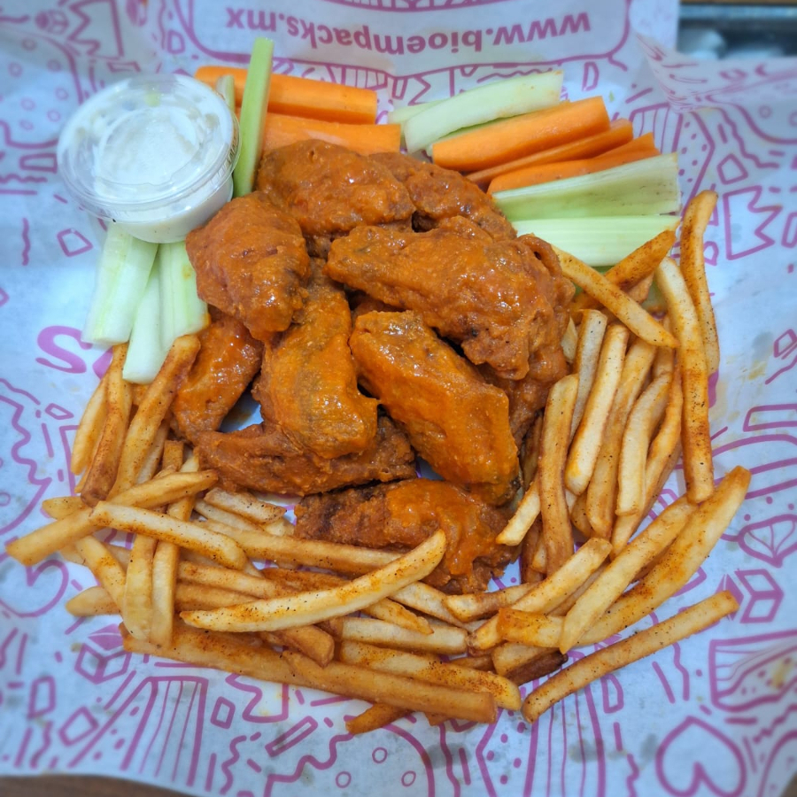 Paquete de 10 alitas, Bastones de Verdura, aderezo tipo Ranch y Orden de Papas A La Francesa.