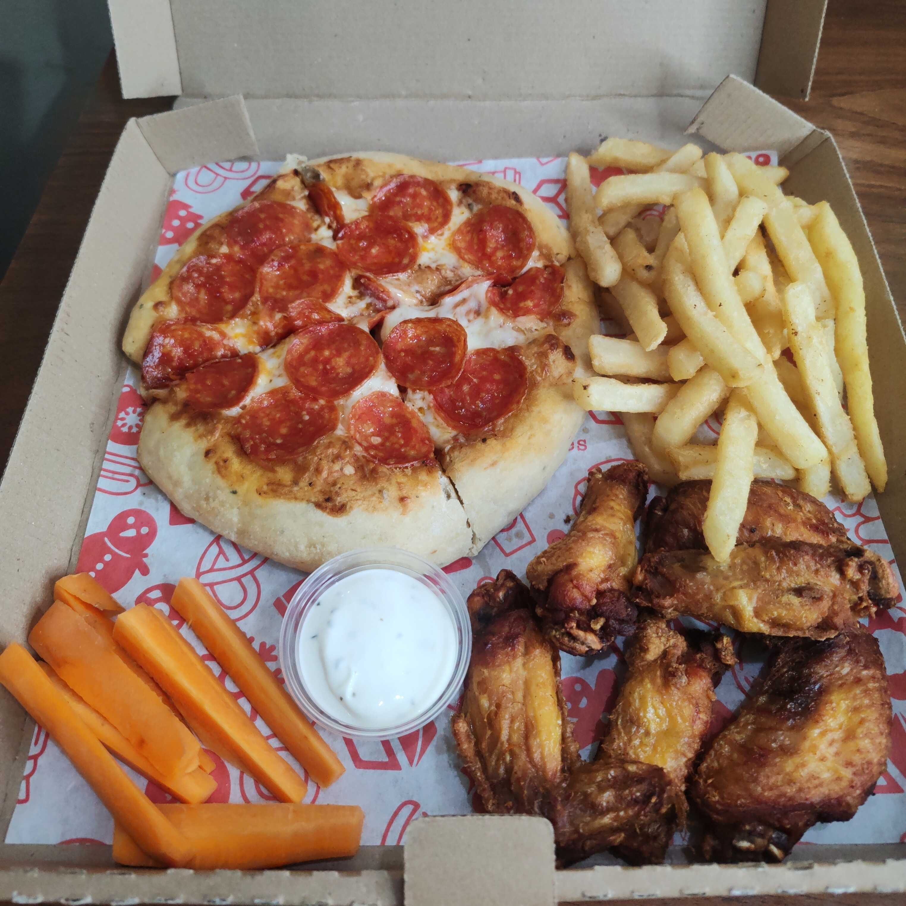 Pizza Chica de Cualquier Especialidad.*1 + Alitas (10 Piezas)*1 + Orden de Papas a La Francesa 250 G*1