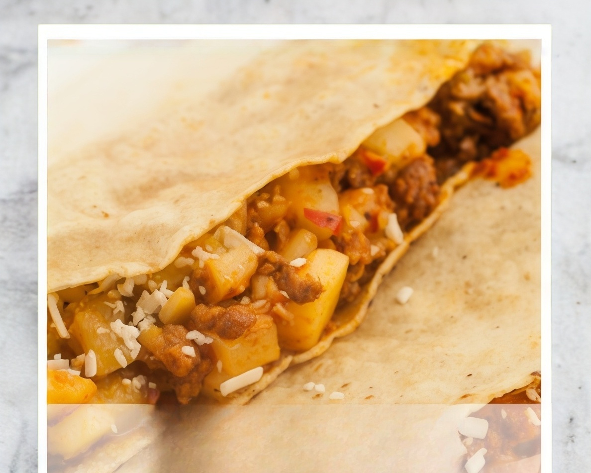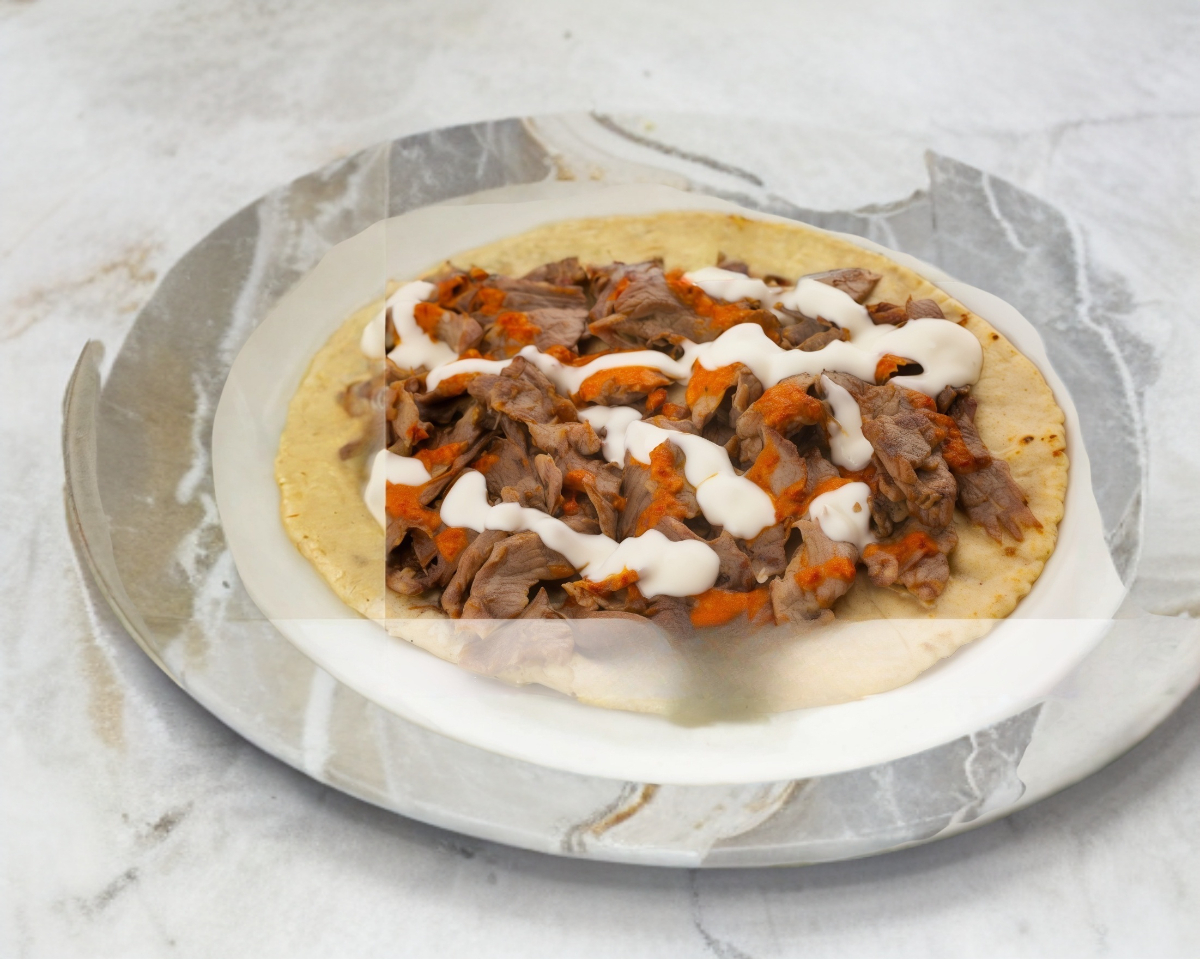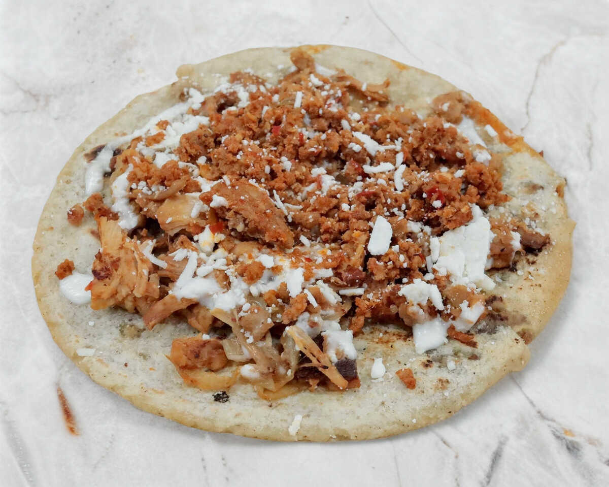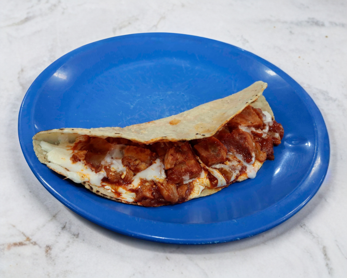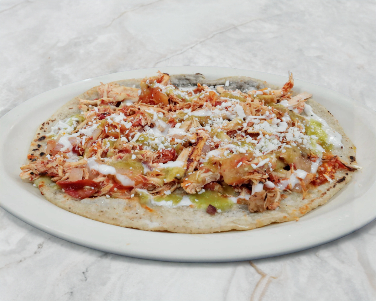 Quesadilla rellena de frijol, crema y queso rayado y encima tinga de pollo para una sola persona