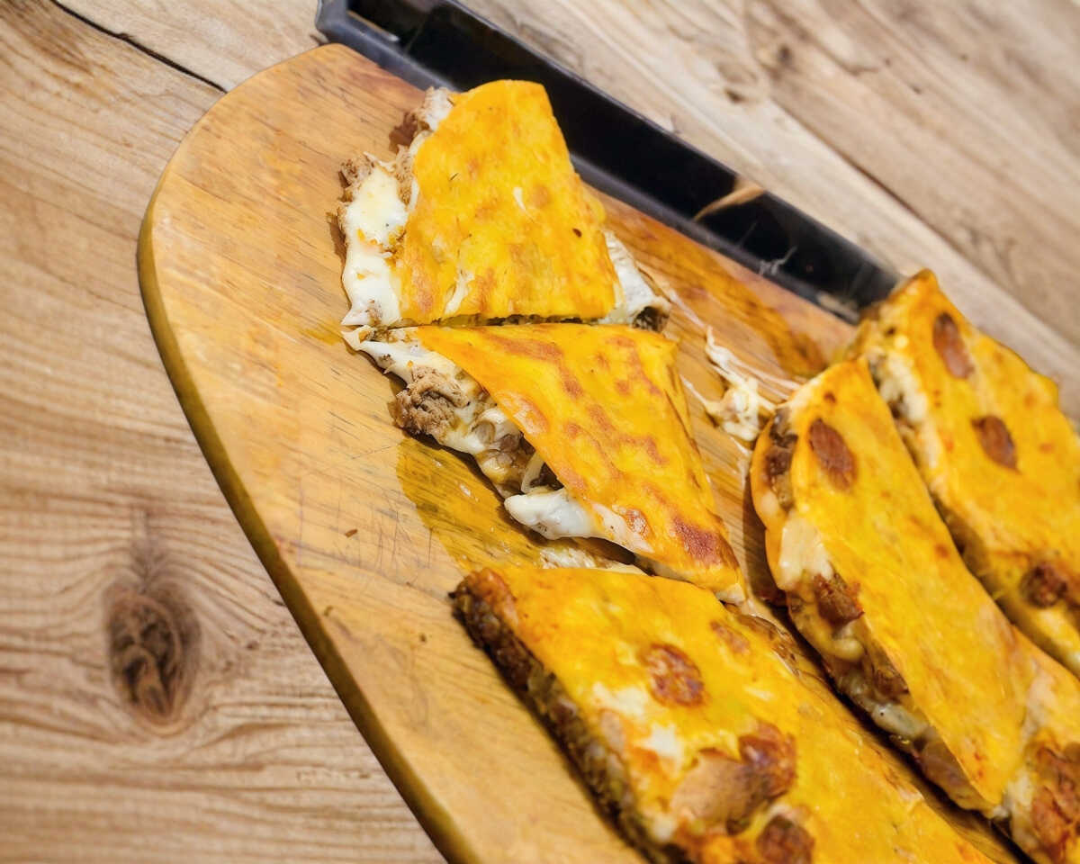 Tortilla de harina de mantequilla, con queso gratinado y birria.