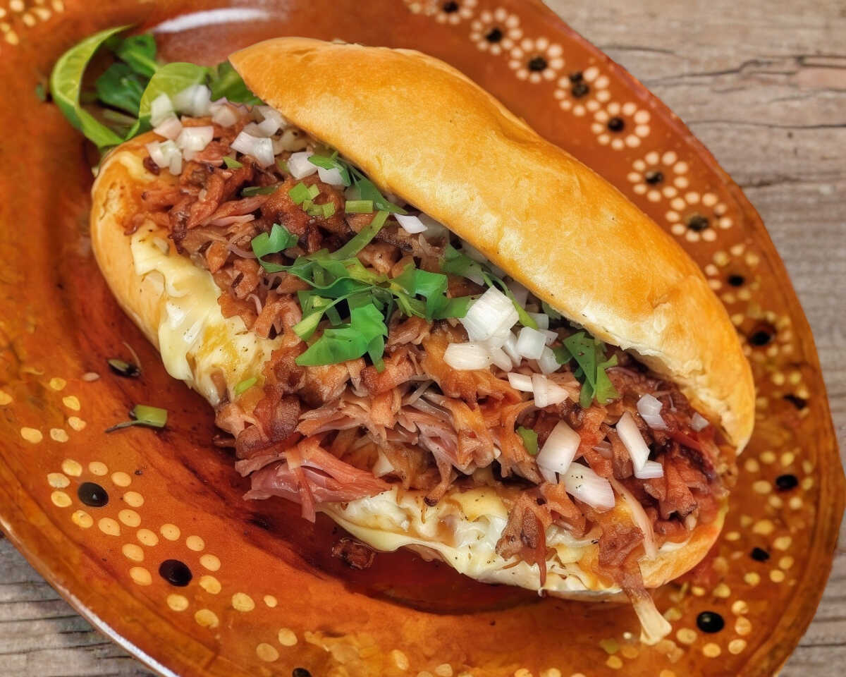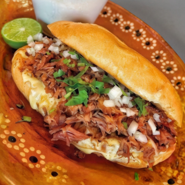 Torta de birria, frijoles, queso gratinado, carne de res, cebolla, jitomate, chiles jalapeños.