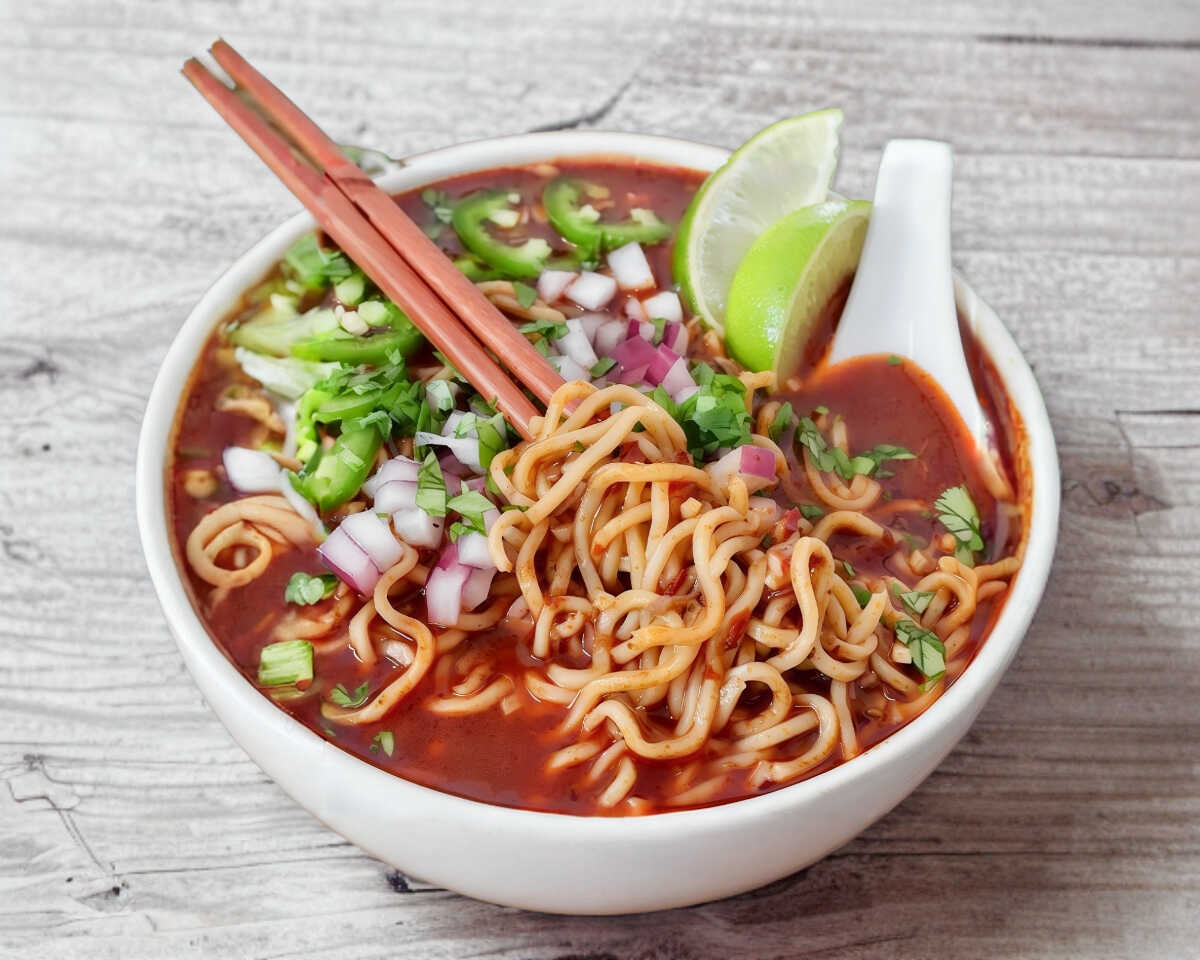 Ramen, carne de birria de res y consomé.
