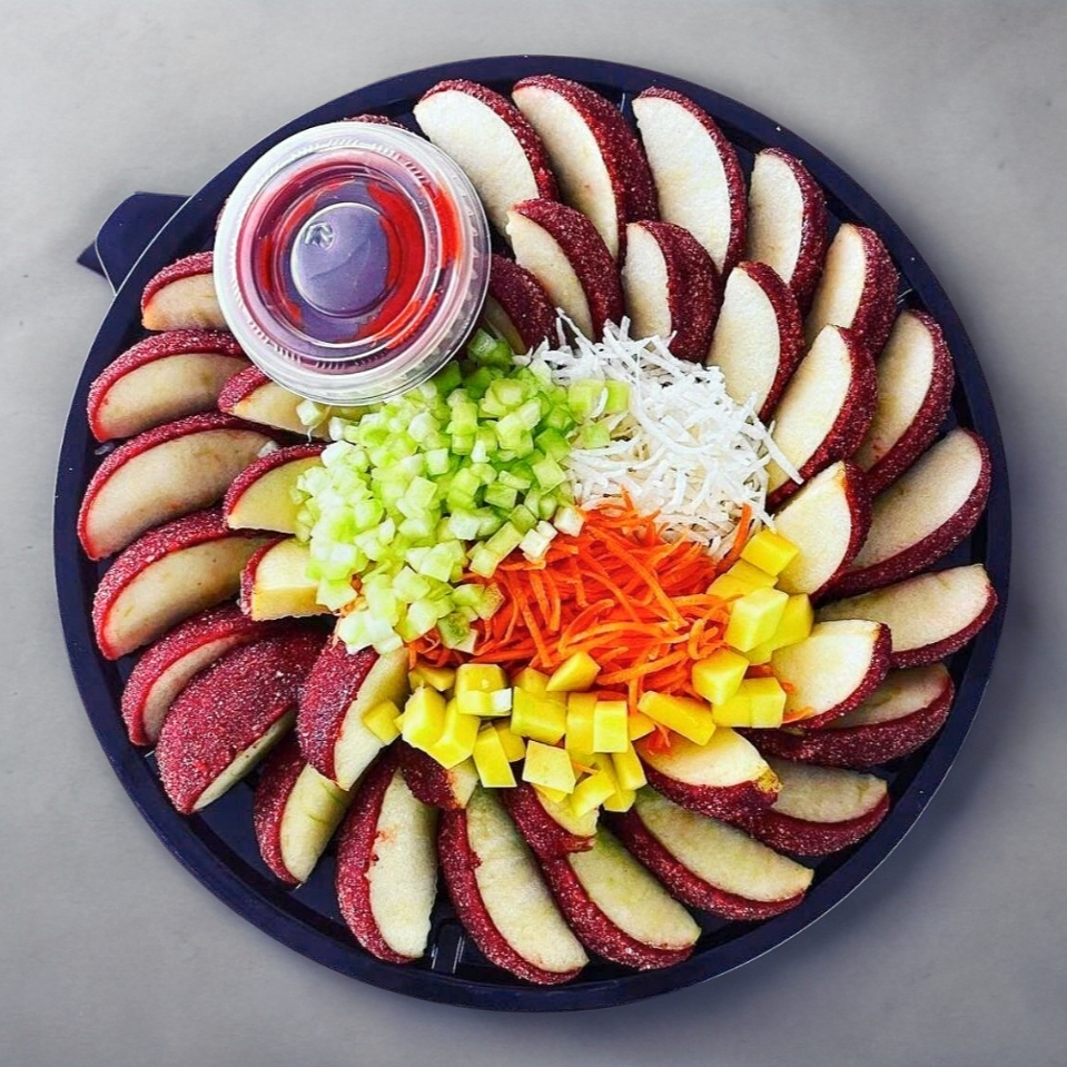 4 manzanas forradas, espolvoredas con Miguelito y al centro pepino, jícama y zanahoria.