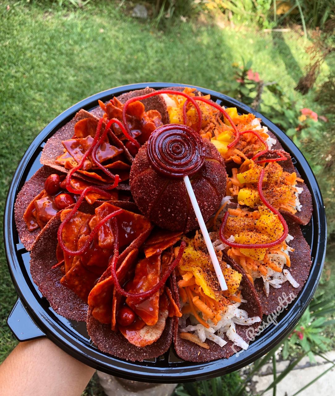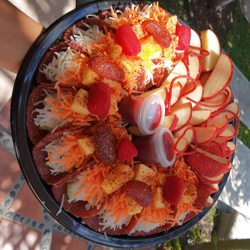 10 Tacos de fruta, pepinos locos, 2 manzanas cubiertas más 3 toppings.
