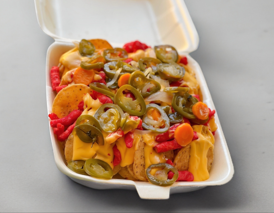 Nachos bañados con queso, jalapeños caseros, cheetos flamin hot.