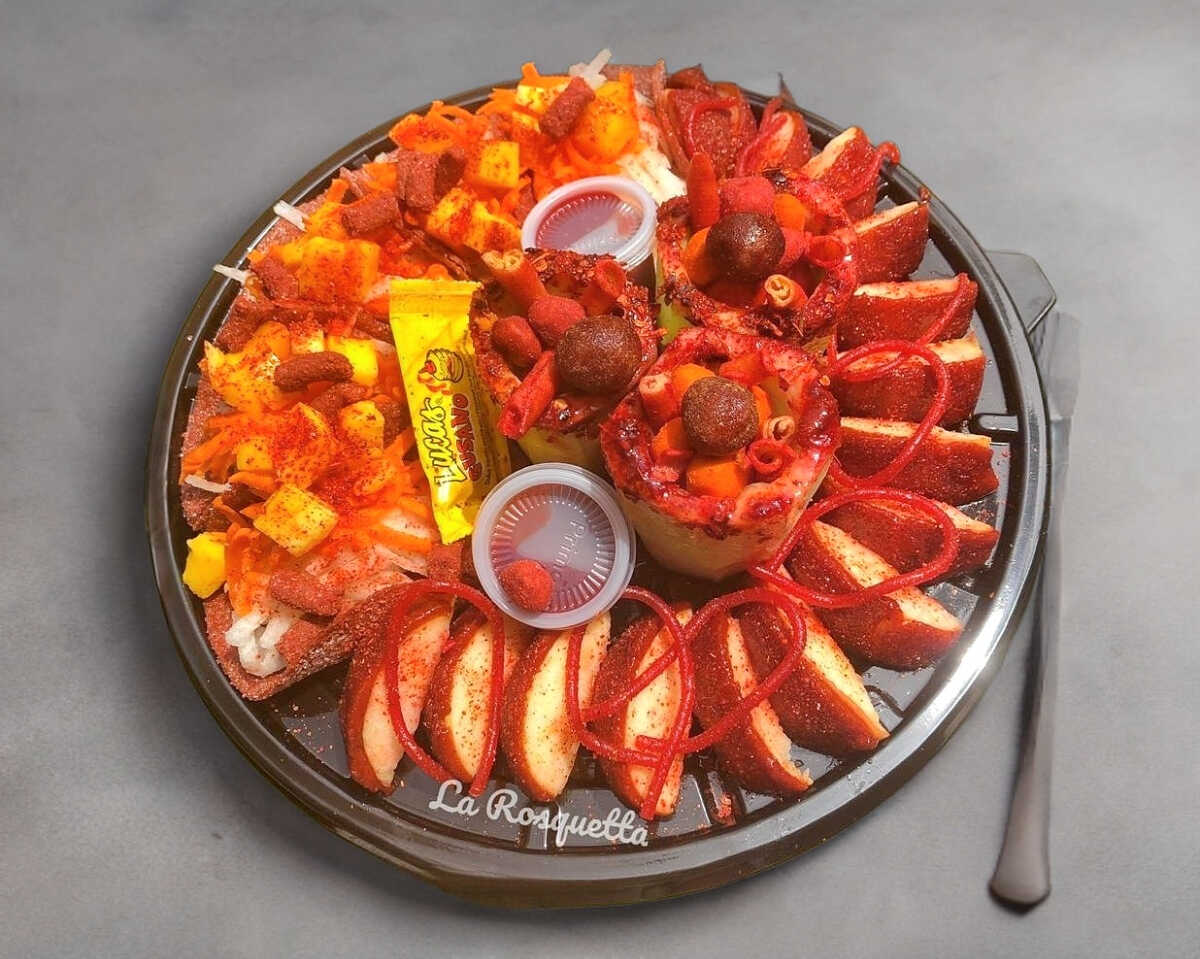 10 Tacos de papas, pepinos locos, 2 manzanas cubiertas más 3 toppings.