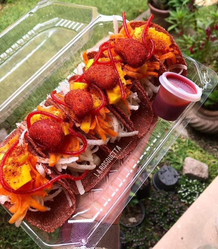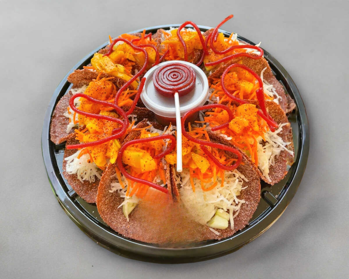 18 Tacos rellenos de pepino, jícama, zanahoría y mango más 3 toppings.