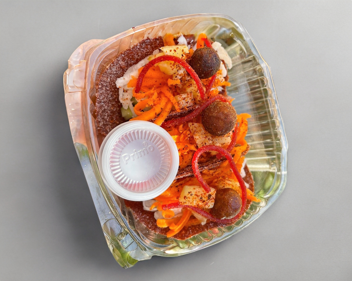 3 Tacos rellenos de pepino, jícama, zanahoría y mango más 1 topping.