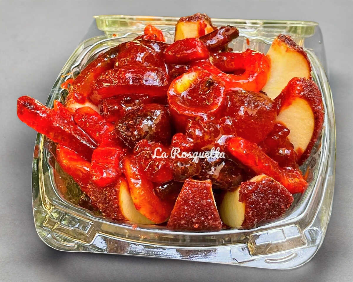 Manzana forrada con un mix de gomitas ahogadas en una salsa preparada a base de chamoy.