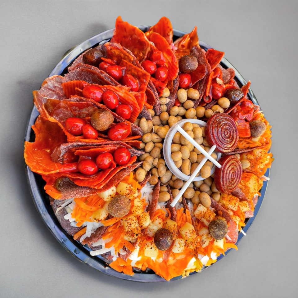 4 manzanas forradas con coberture de tamarindo y 10 taquitos rellenos de pepino, jícama, zanahoria y/o mango - piña. Incluye 3 toppings y vaso de chamoy preparado.