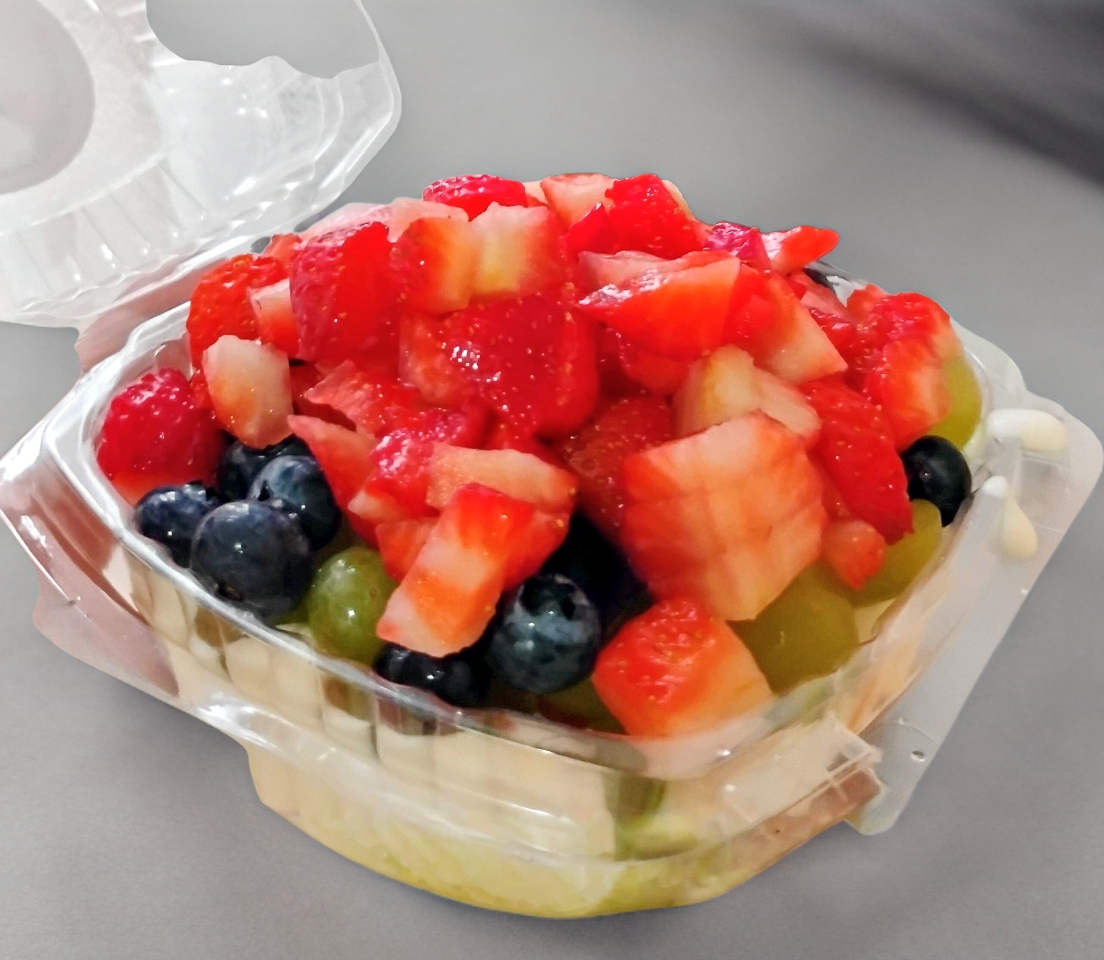 Fresa, Durazno, Uva verde y blueberries cubierta con nuestra crema especial, lechera y nuez picada