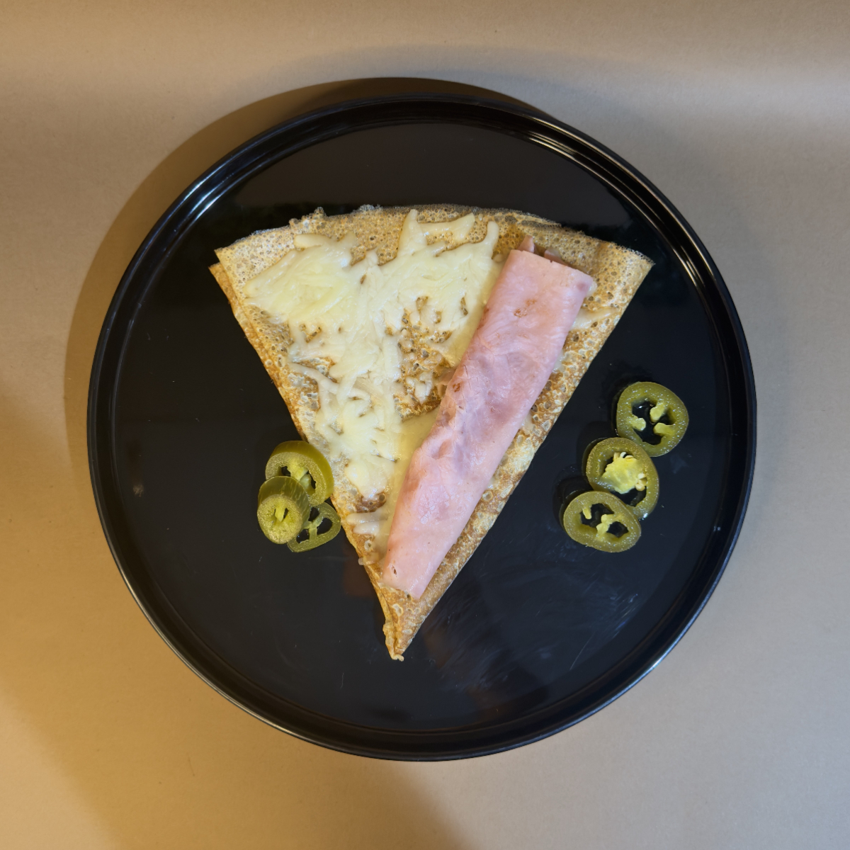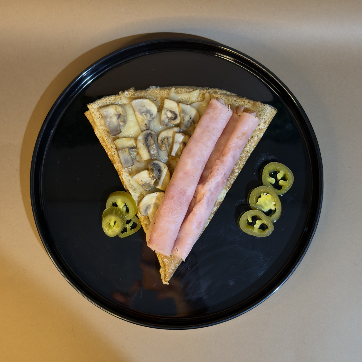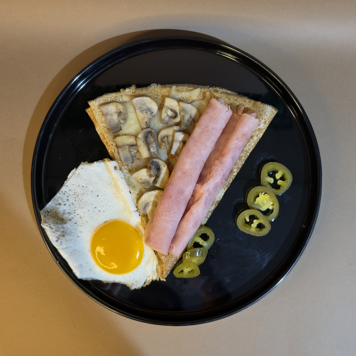 Huevo, queso manchego, jamón, champiñon y queso mozarella