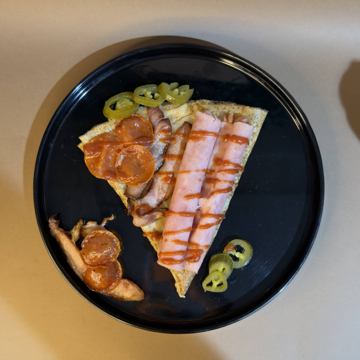 Salsa italiana, queso manchego, tocino, jamón y pepperoni