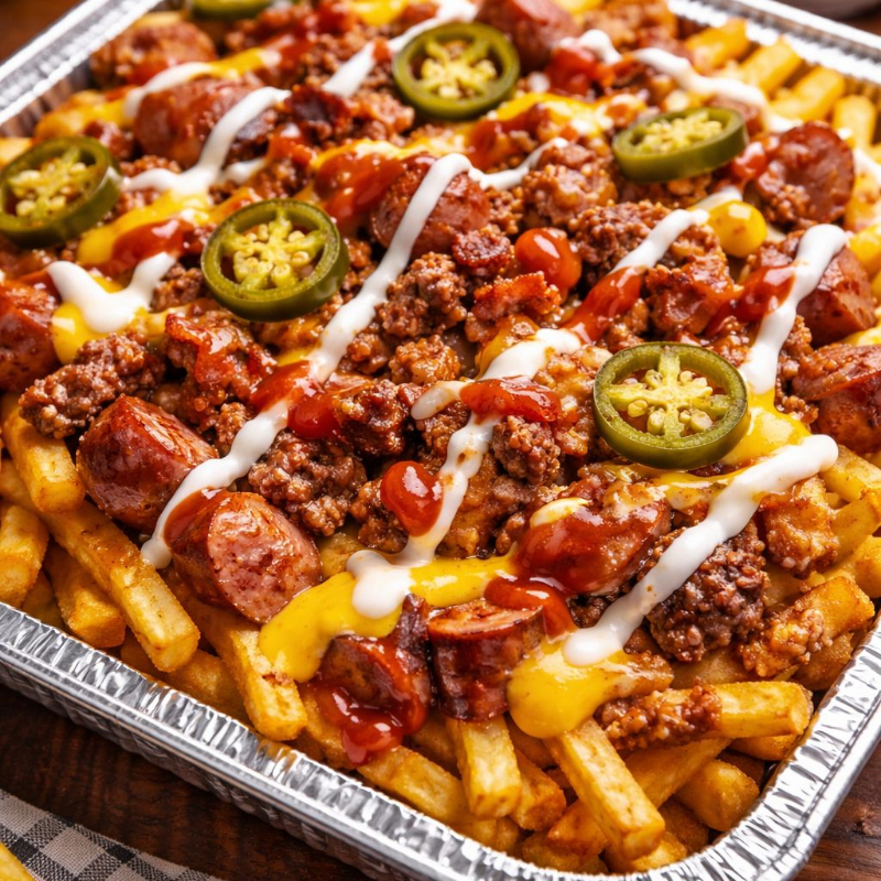 Crujientes papas a la francesa cargadas con carne, salchicha, tocino troceado, longaniza frita queso derretido y jalapeños, coronadas con aderezo de la casa. ¡Perfecta para compartir!3-4 personas