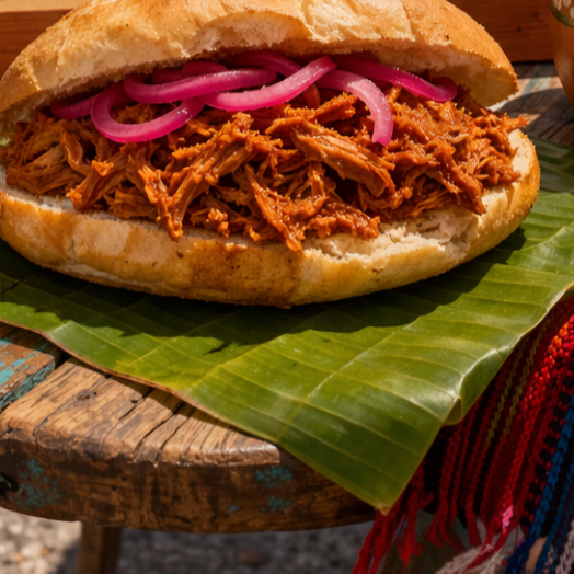 Pan dorado con mantequilla, relleno de cochinita pibil , acompañada de cebolla morada curtida y un toque de salsa que le da el balance perfecto entre sabor y picante.