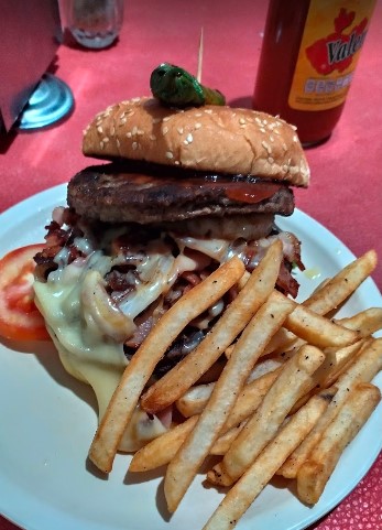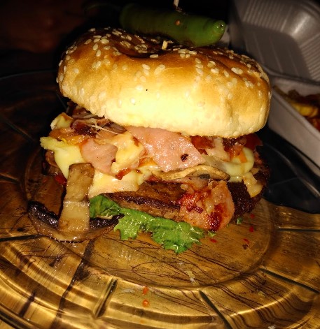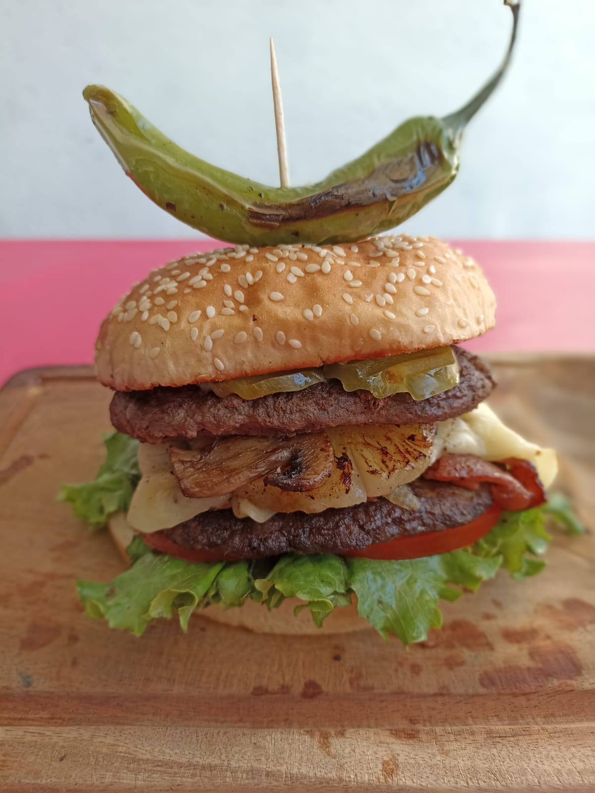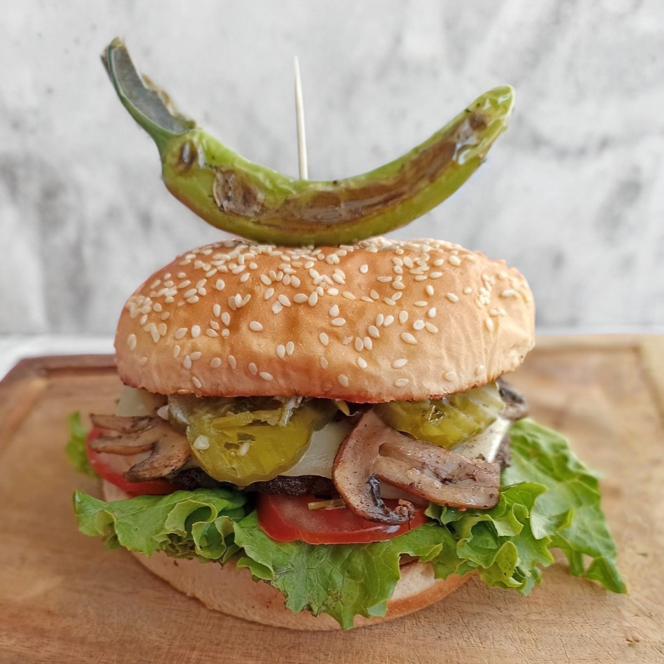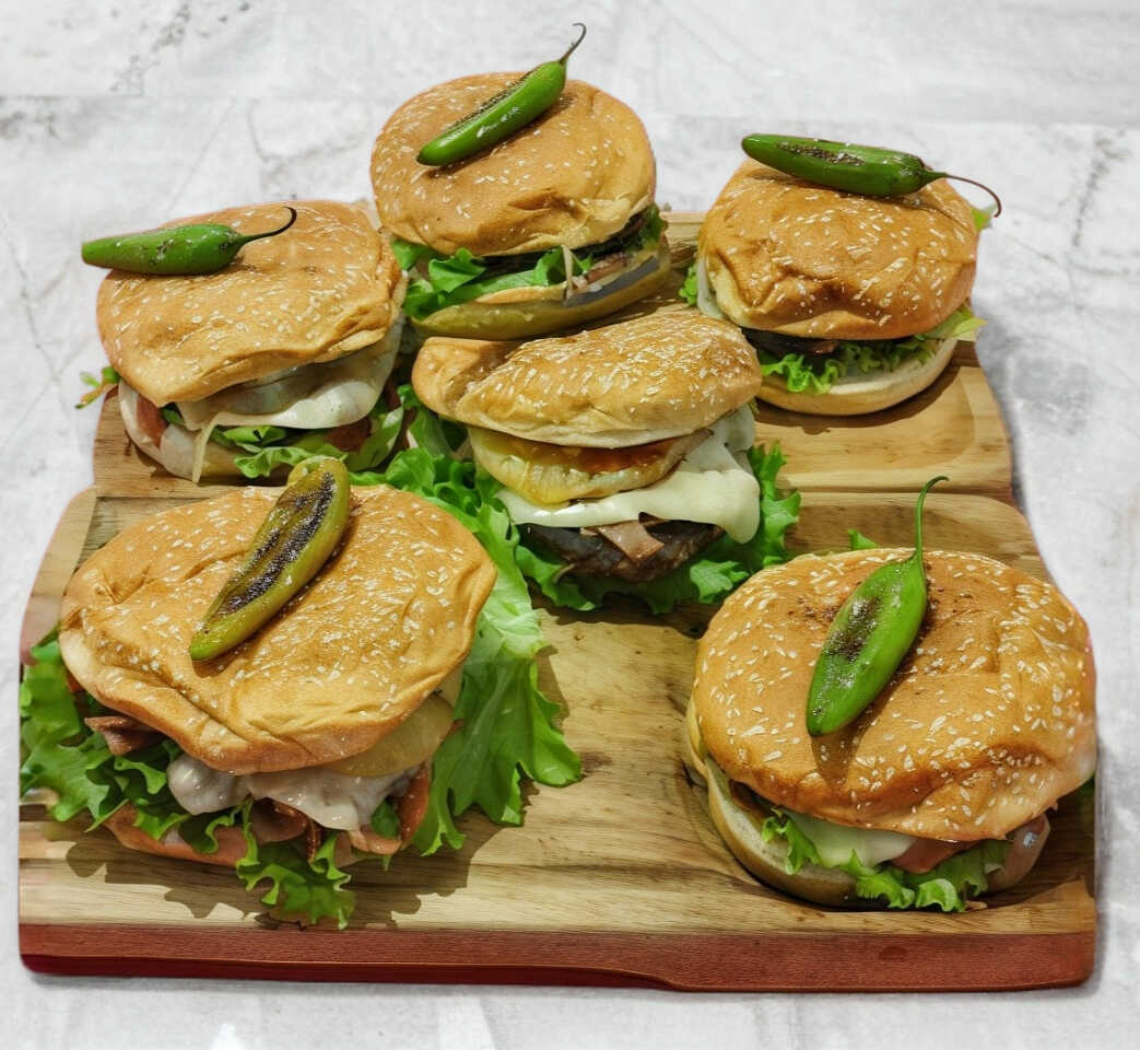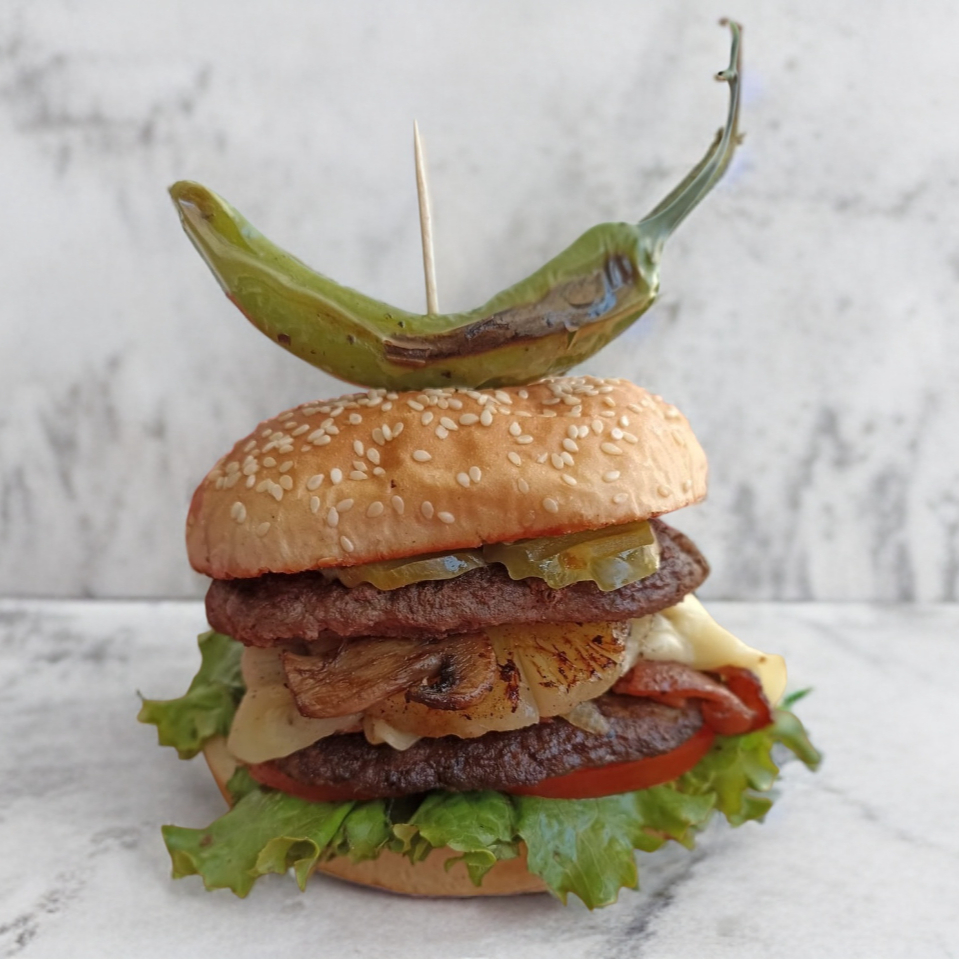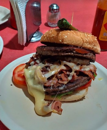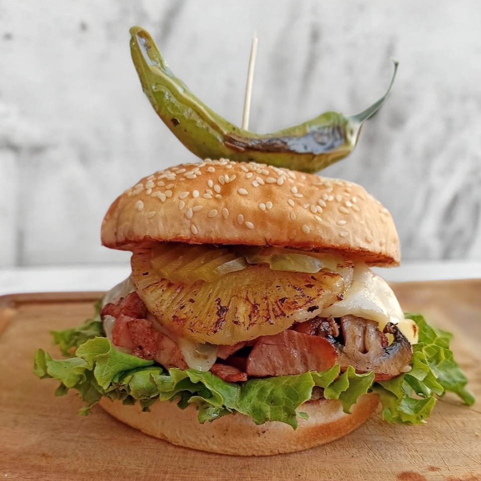 Doble carne, tocino, queso manchego, piña, champiñones, cebolla caramelizada, lechuga, jitomate, pepinillos, mayonesa, catsup, mostaza, y chimichurri.