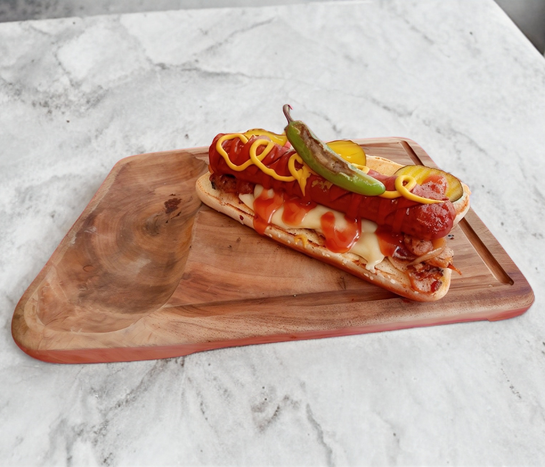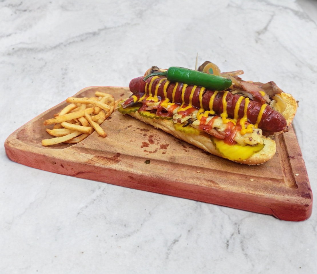 Salchicha de 180grs, tocino , queso manchego, champiñones, cebolla caramelizada, pepinillos, mayonesa, catsup, mostaza.