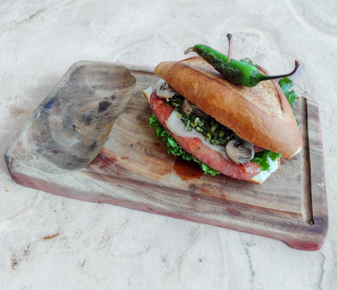 Chorizo argentino, queso manchego, champiñones, cebolla caramelizada, lechuga, jitomate, mayonesa y chimichurri.