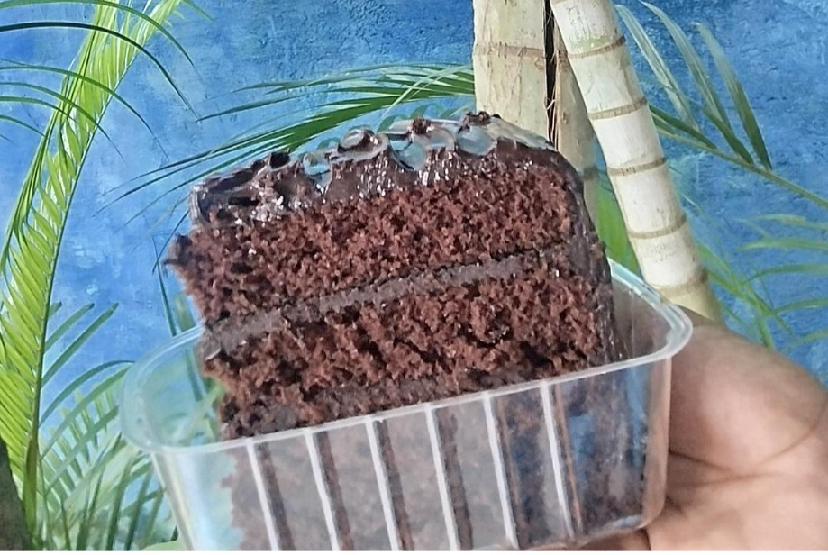 Rebanada de pastel de chocolate húmedo y esponjoso con cobertura de cacao.