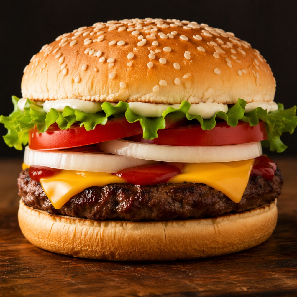 Carne jugosa, queso amarillo, lechuga, jitomate, cebolla y aderezo.