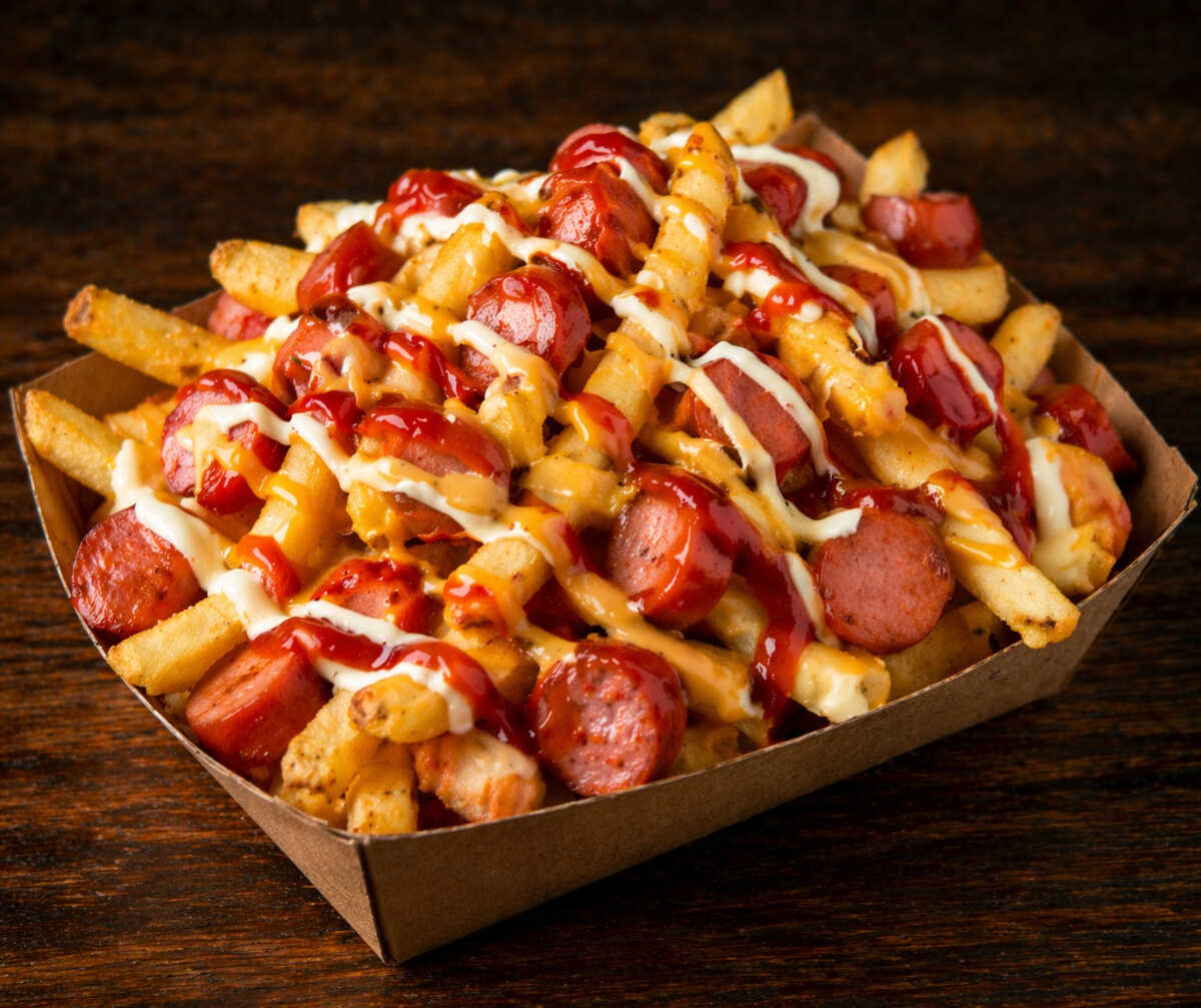 Combinación de papas fritas con trozos de salchicha frita, bañadas en queso y salsa catsup