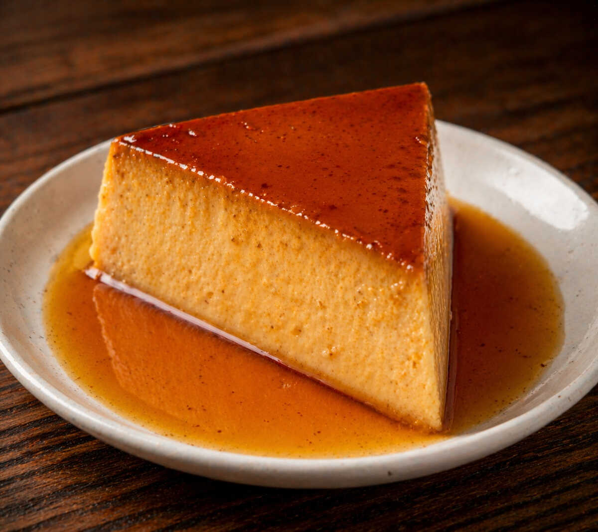 Postre clásico de vainilla con una suave textura y baño de caramelo.