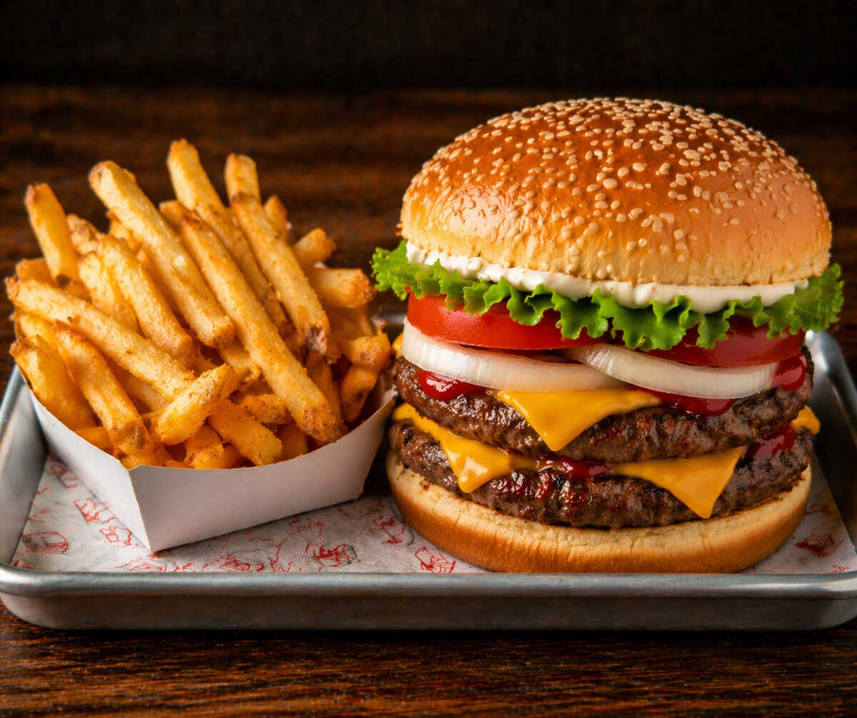 Hamburguesa doble carne y doble queso acompañada de papas fritas.