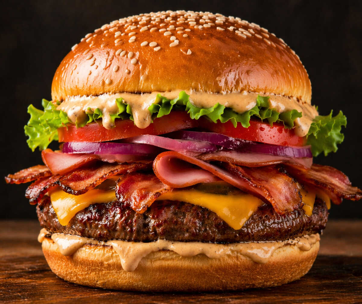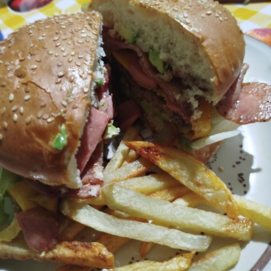 Carne jugosa más tocino, salchicha, jamón y queso amarillo y vegetales.