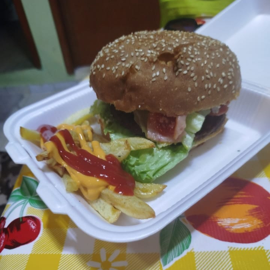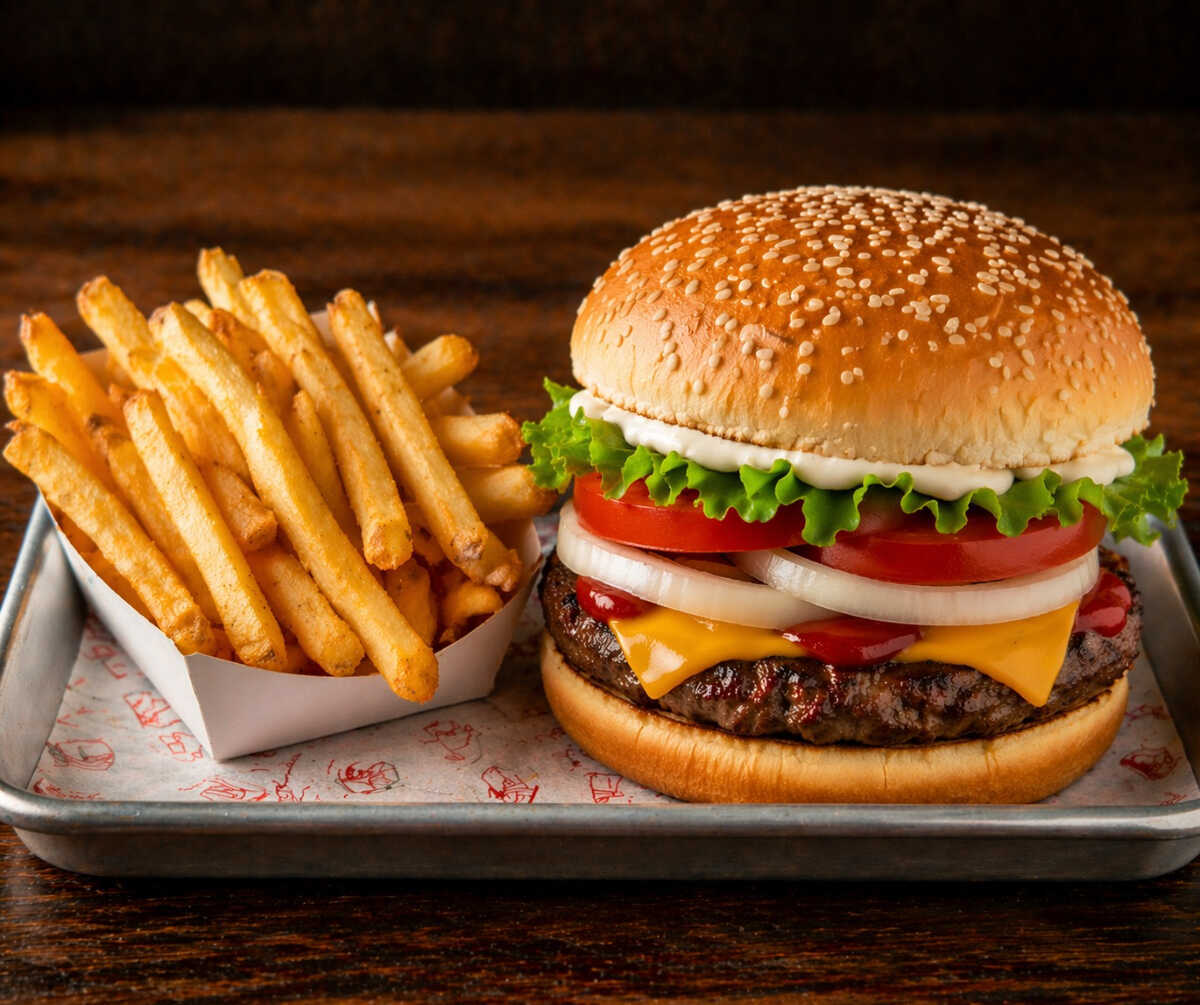 Hamburguesa clásica acompañada de una porción de papas fritas.