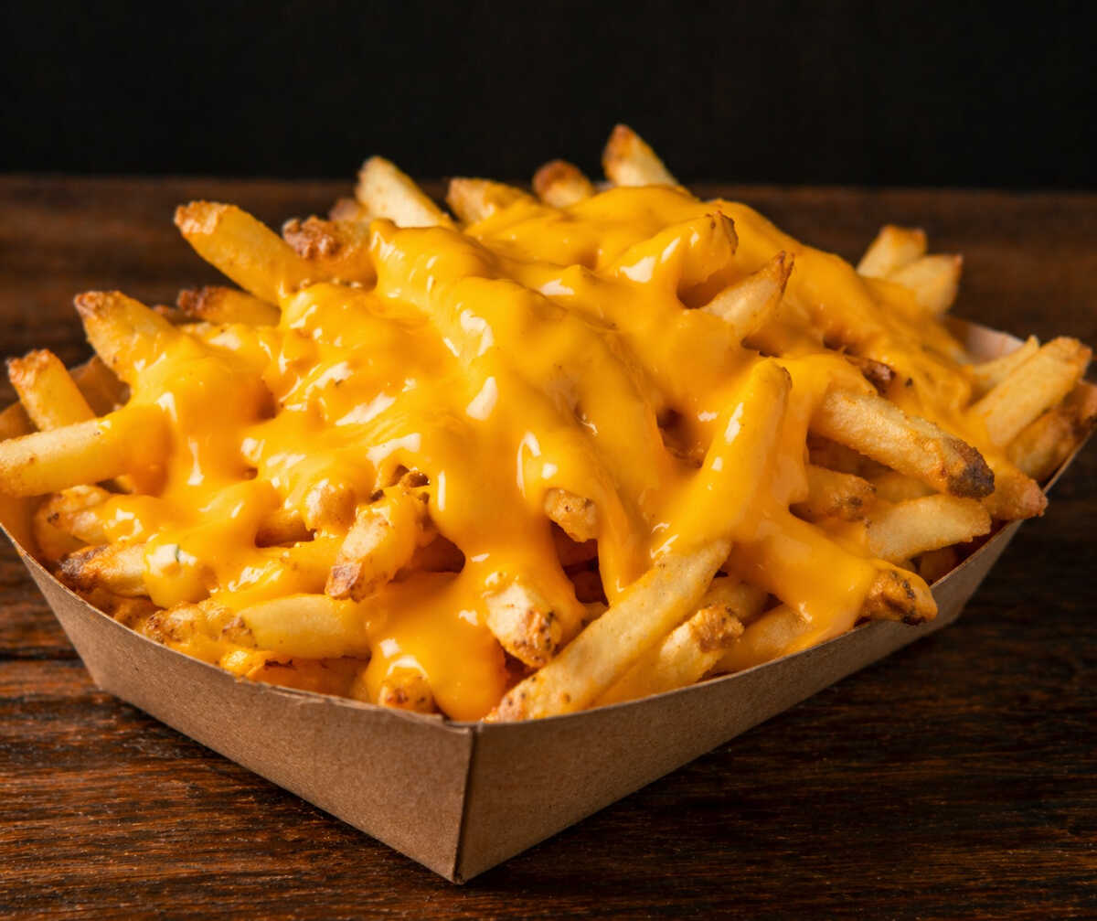 Porción de papas fritas bañadas en una cremosa salsa de queso.