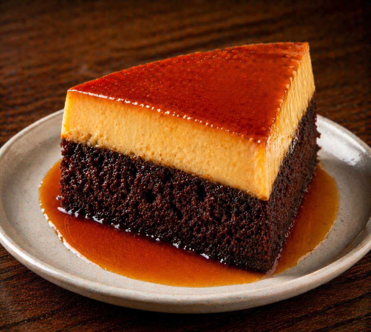 Combinación de pastel de chocolate y flan de vainilla horneados juntos.