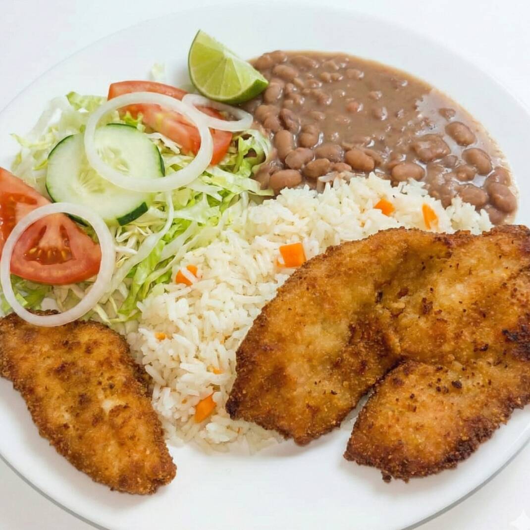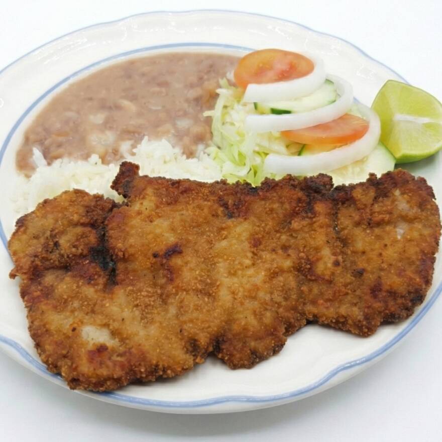 Lechuga, jitomate, cebolla y limón, milanesa , marinada con ajo, cebolla, pimienta y sal