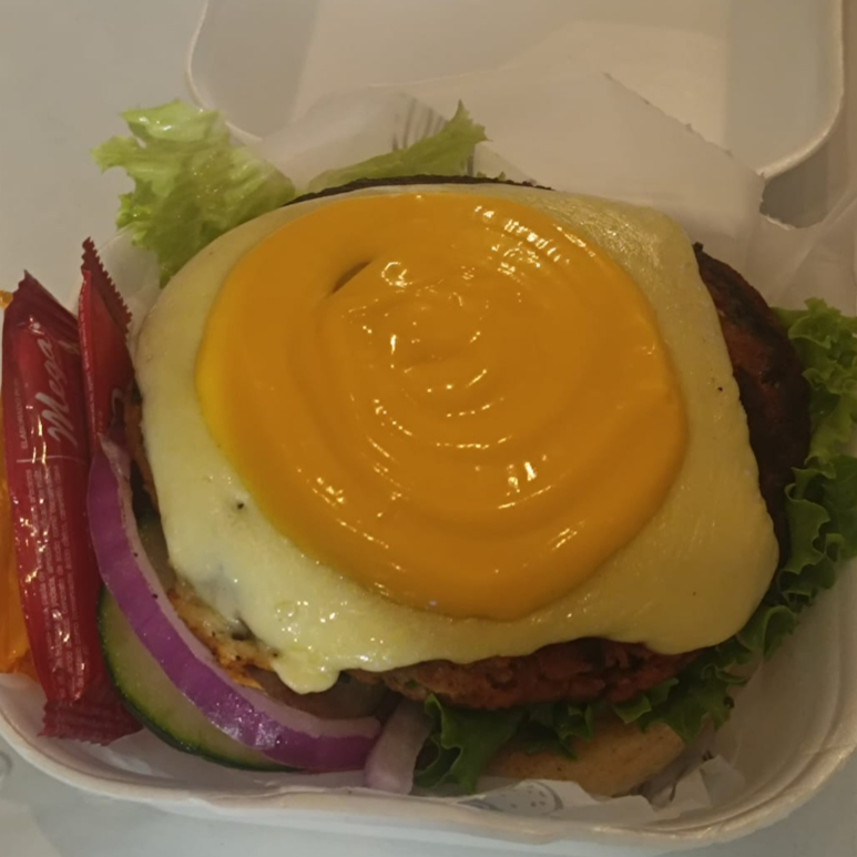 Carne de la casa (130g), queso manchego, lechuga, jitomate, cebolla morada, mayonesa