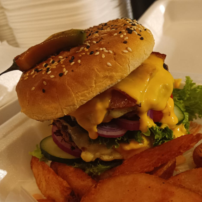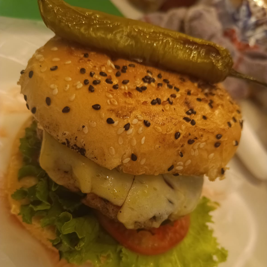 Doble carne de la casa (260g) tocino, queso manchego, queso de la casa, lechuga, jitomate, cebolla morada, mayonesa